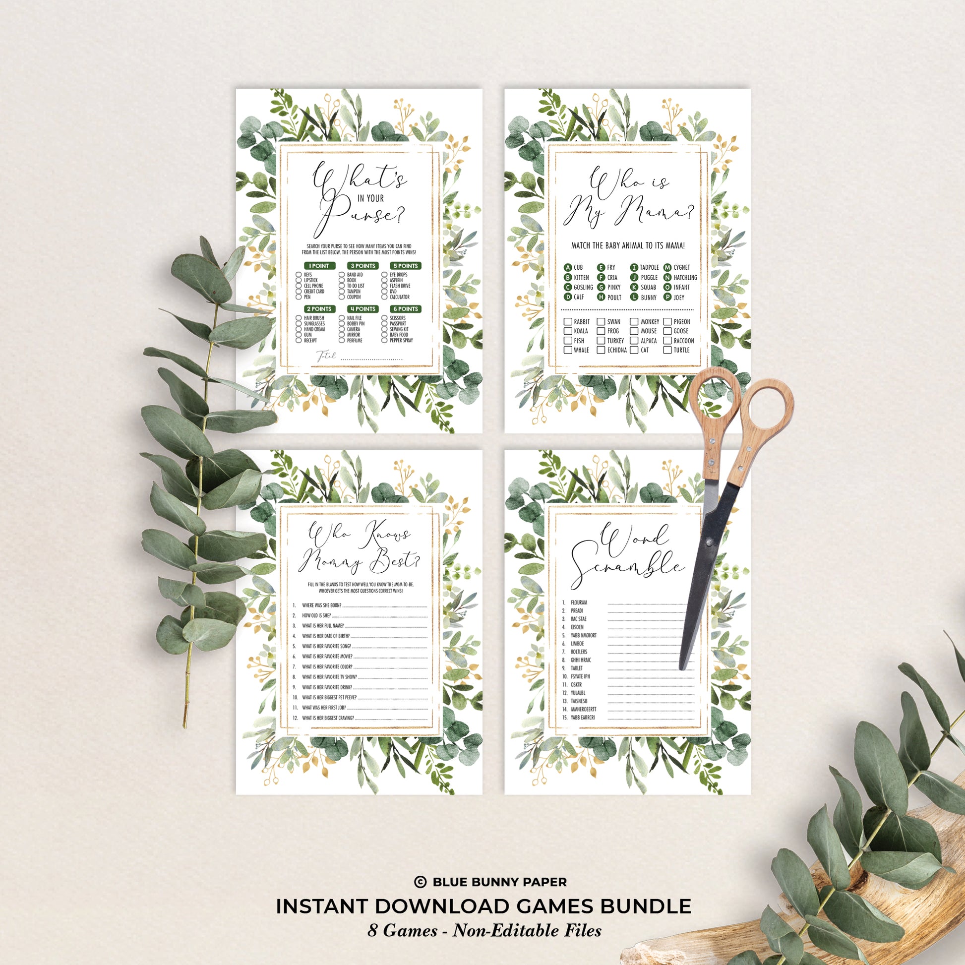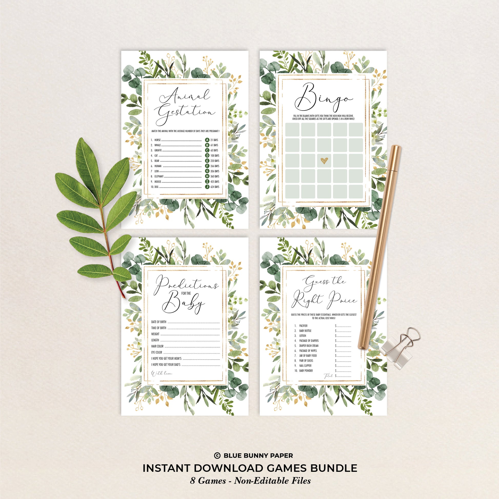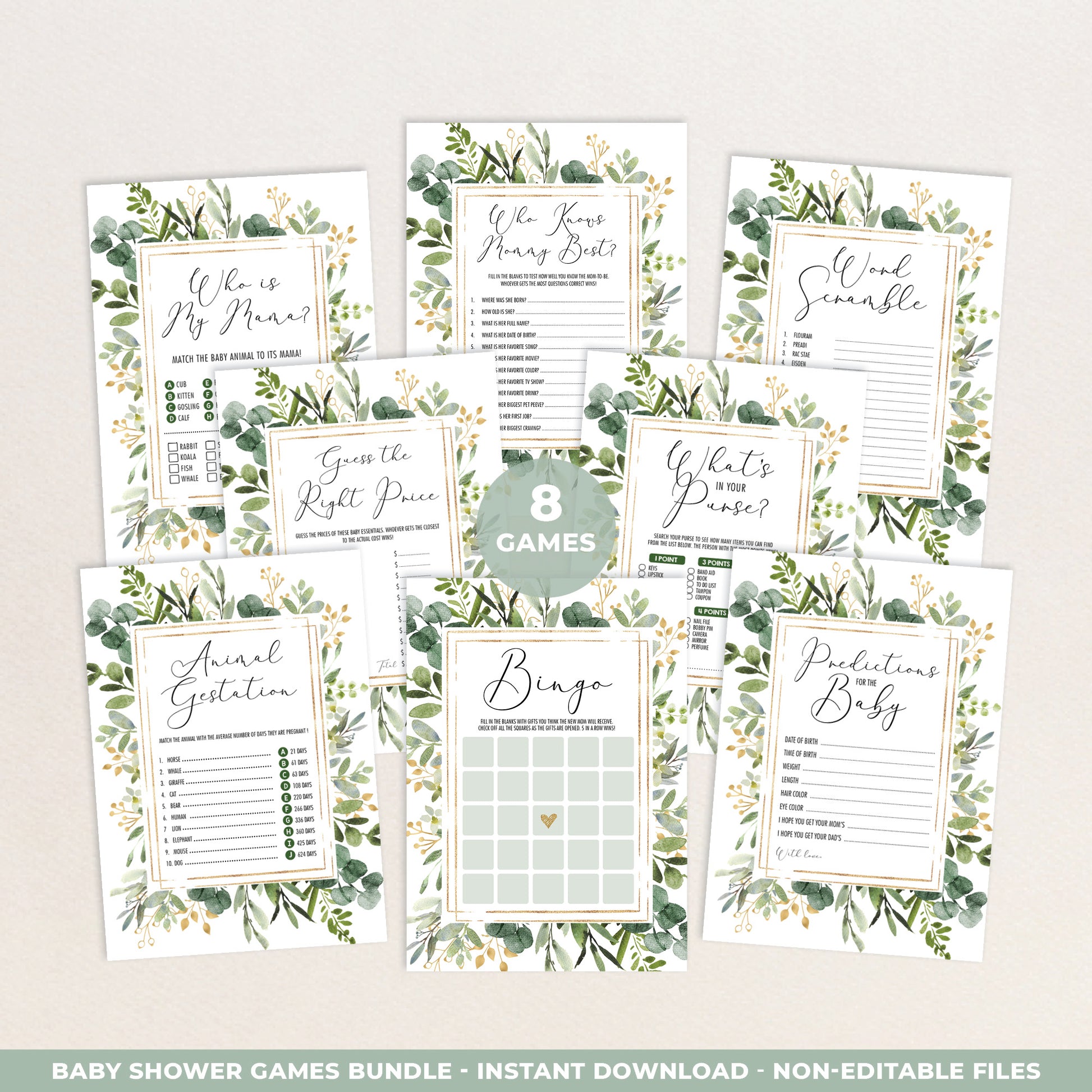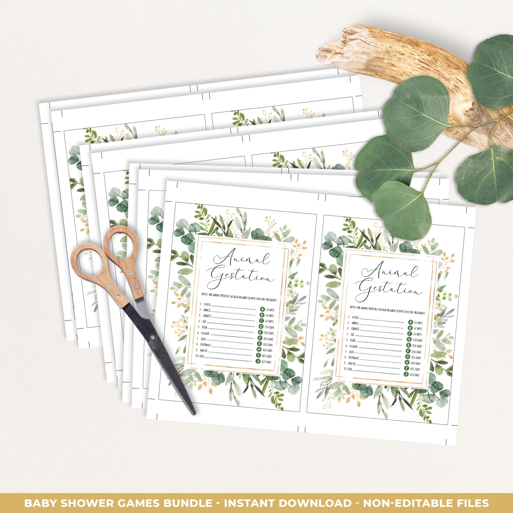 Keep your guests entertained at your baby shower with our fun and interactive shower games. The elegant design features stylish botanical greenery wreath and modern typography. Download the printable games immediately after purchase.