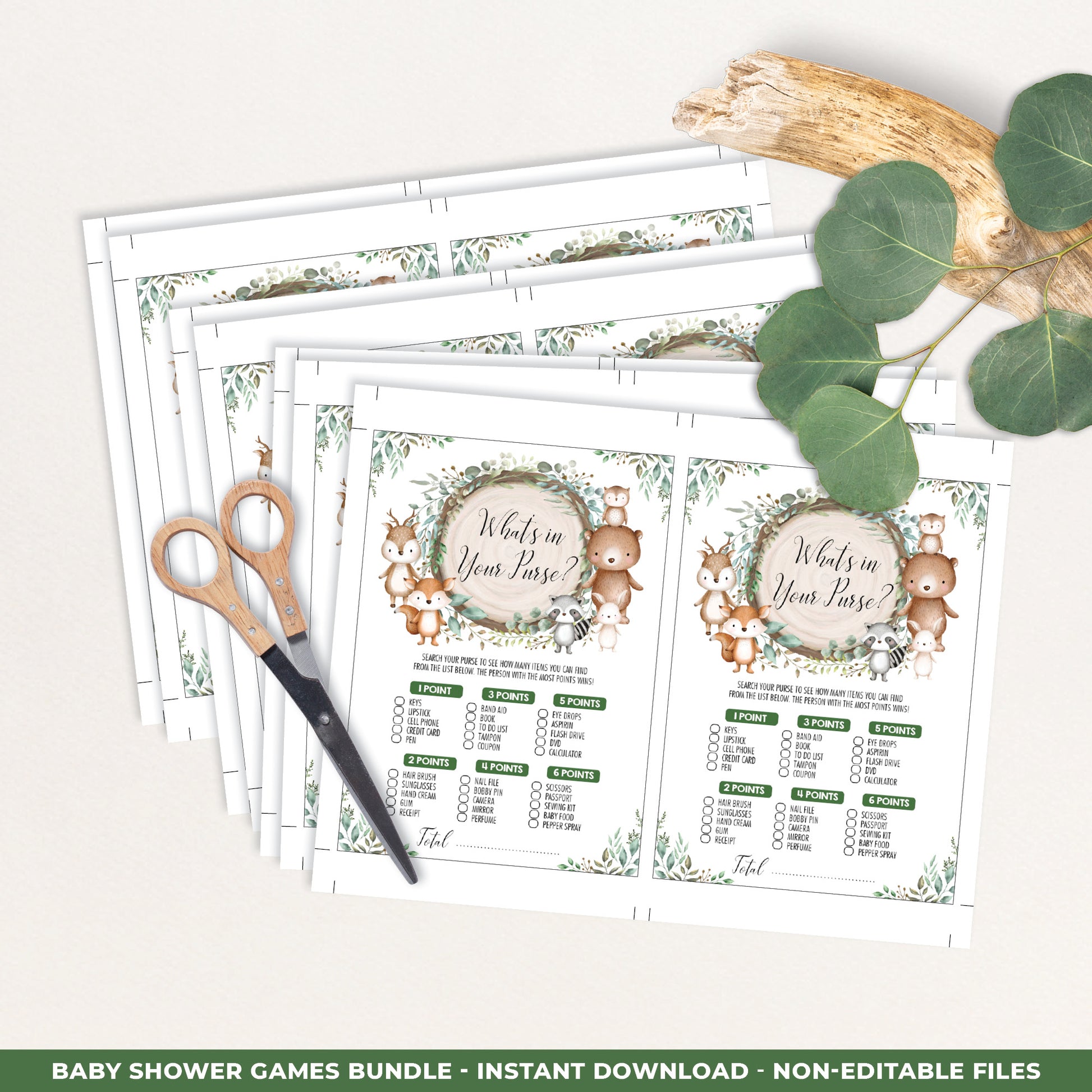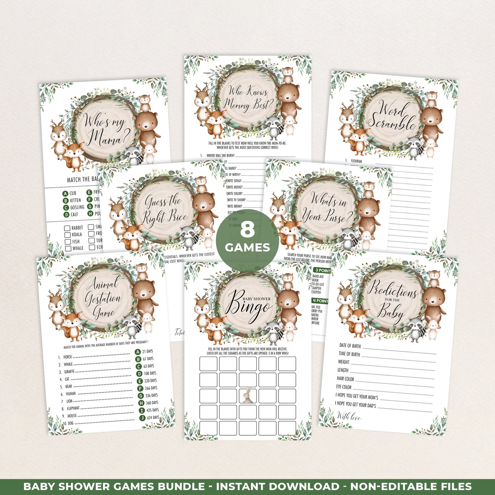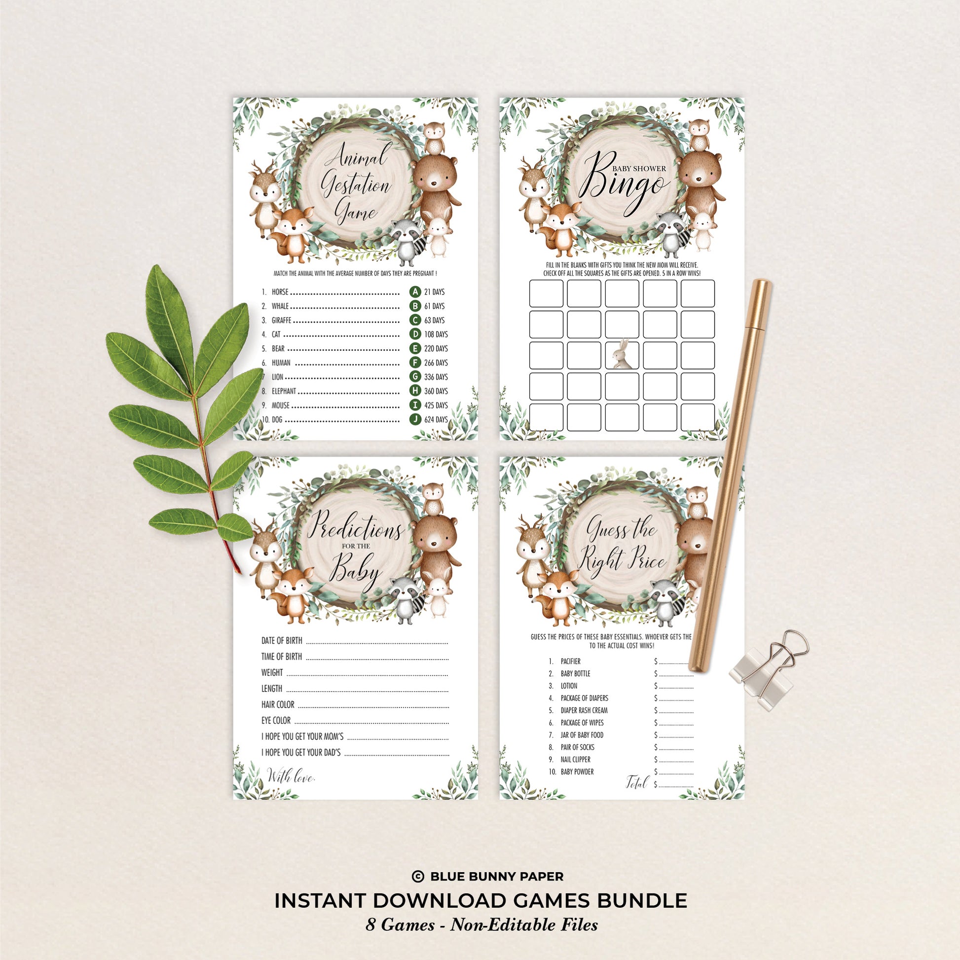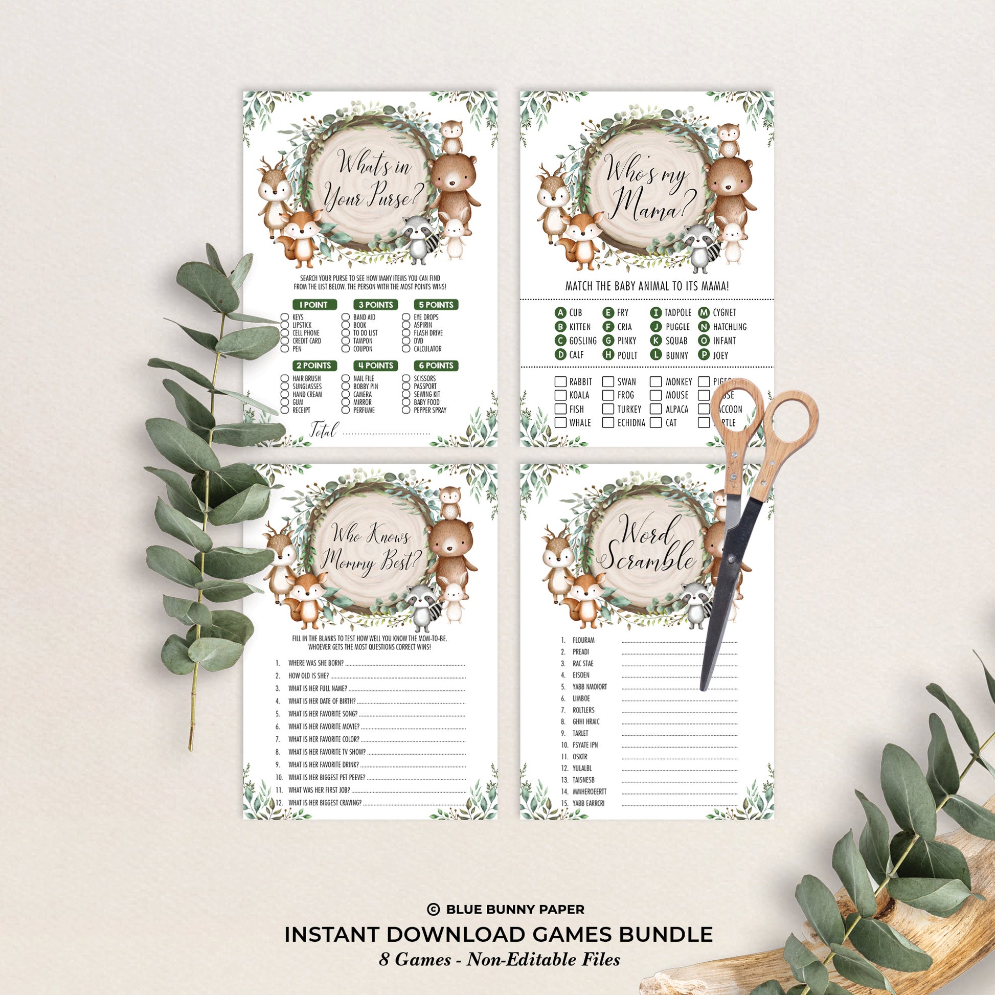 Keep your guests entertained at your baby shower with fun and interactive baby shower games. The adorable design features cute woodland animals and rustic greenery leaves. Download the printable games immediately after purchase.
