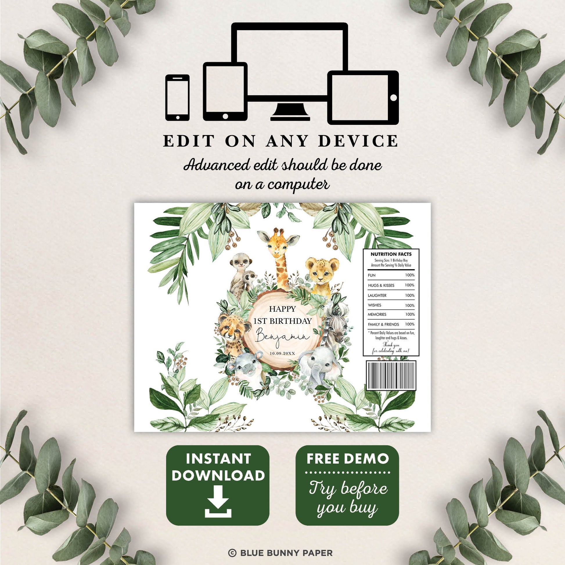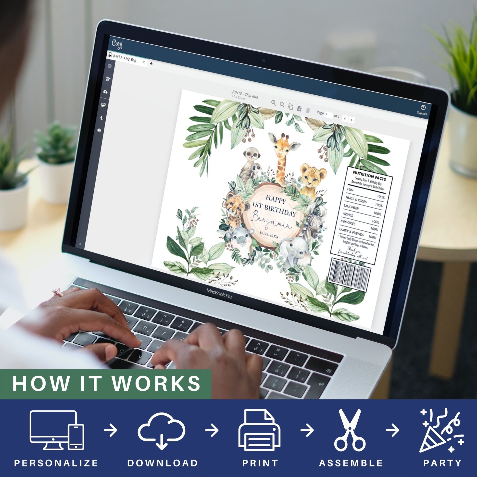 Take your party to another level with our designer chip bag templates! You can customize the chip bag with any wording you want to give your party an extra special touch. Featuring cute safari animals and watercolor greenery leaves, this adorable favor idea will definitely put a smile on your guests' faces! The neutral color palette also makes this design perfect for a gender-neutral birthday or baby shower.
