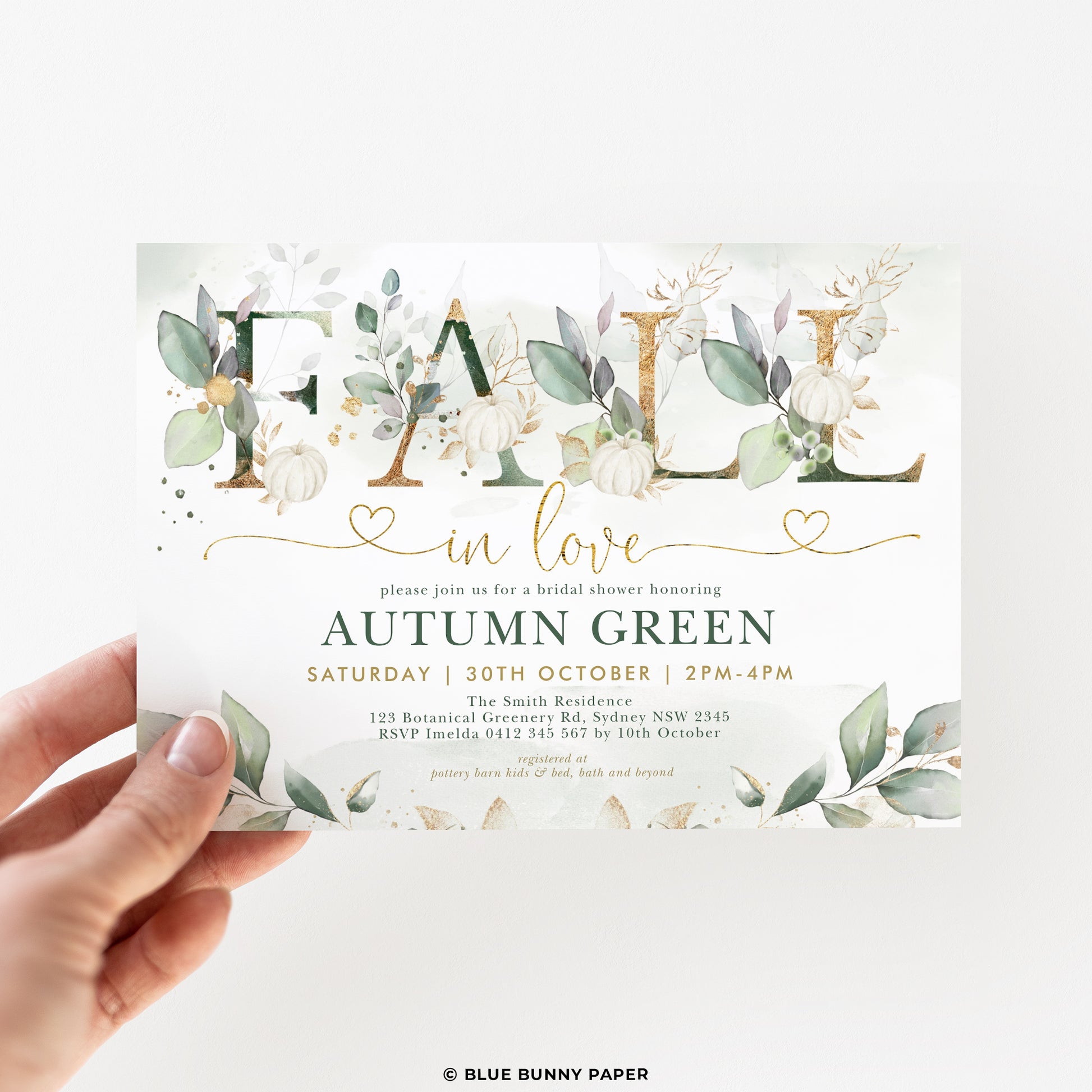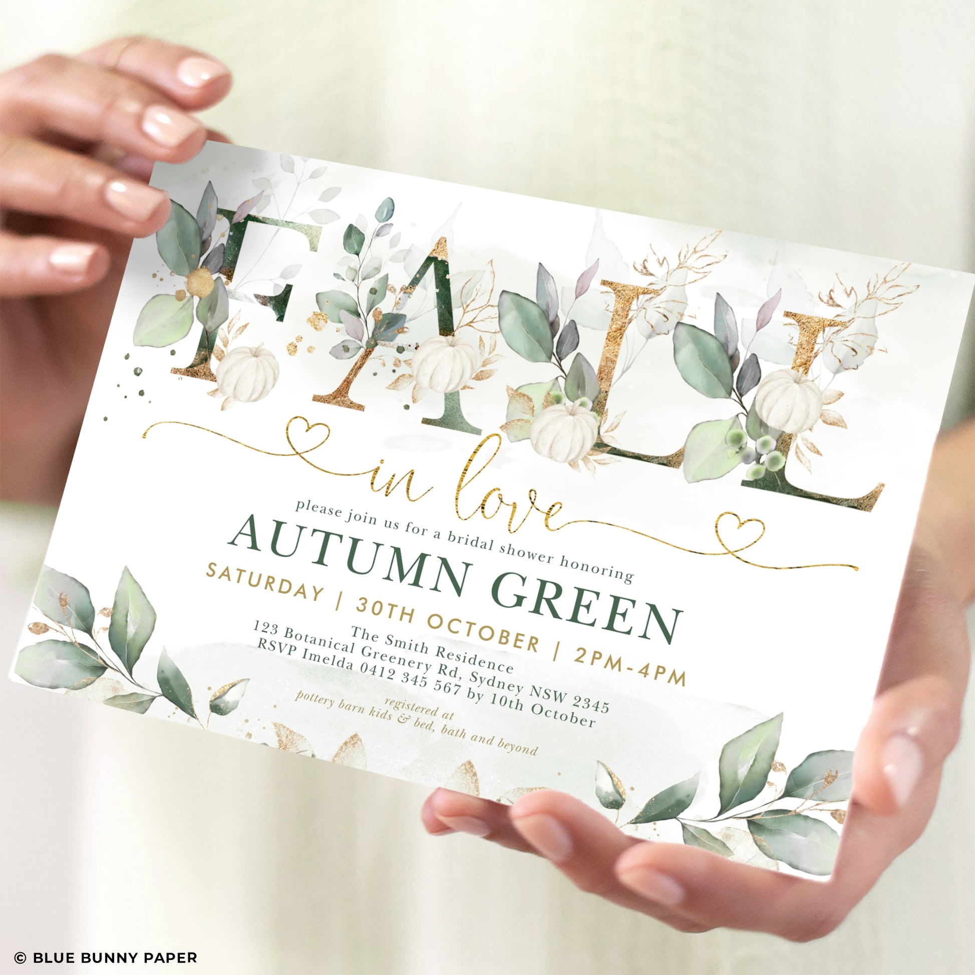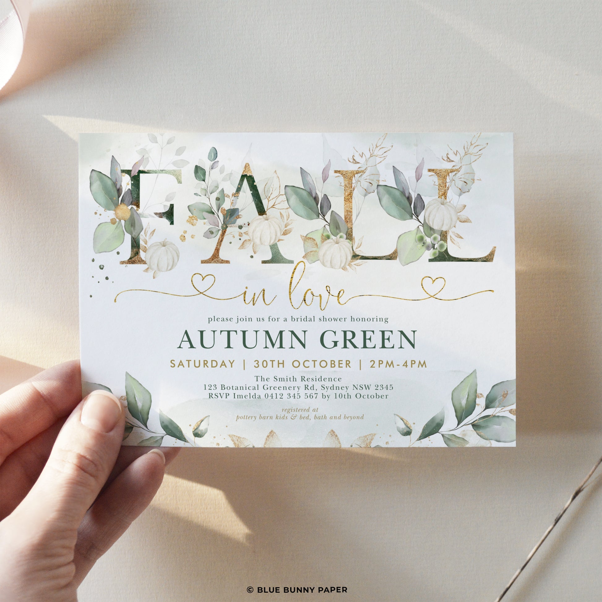 This elegant autumn bridal shower invitation features beautiful alabaster white pumpkins, gorgeous leafy greenery foliage and gold accents.
