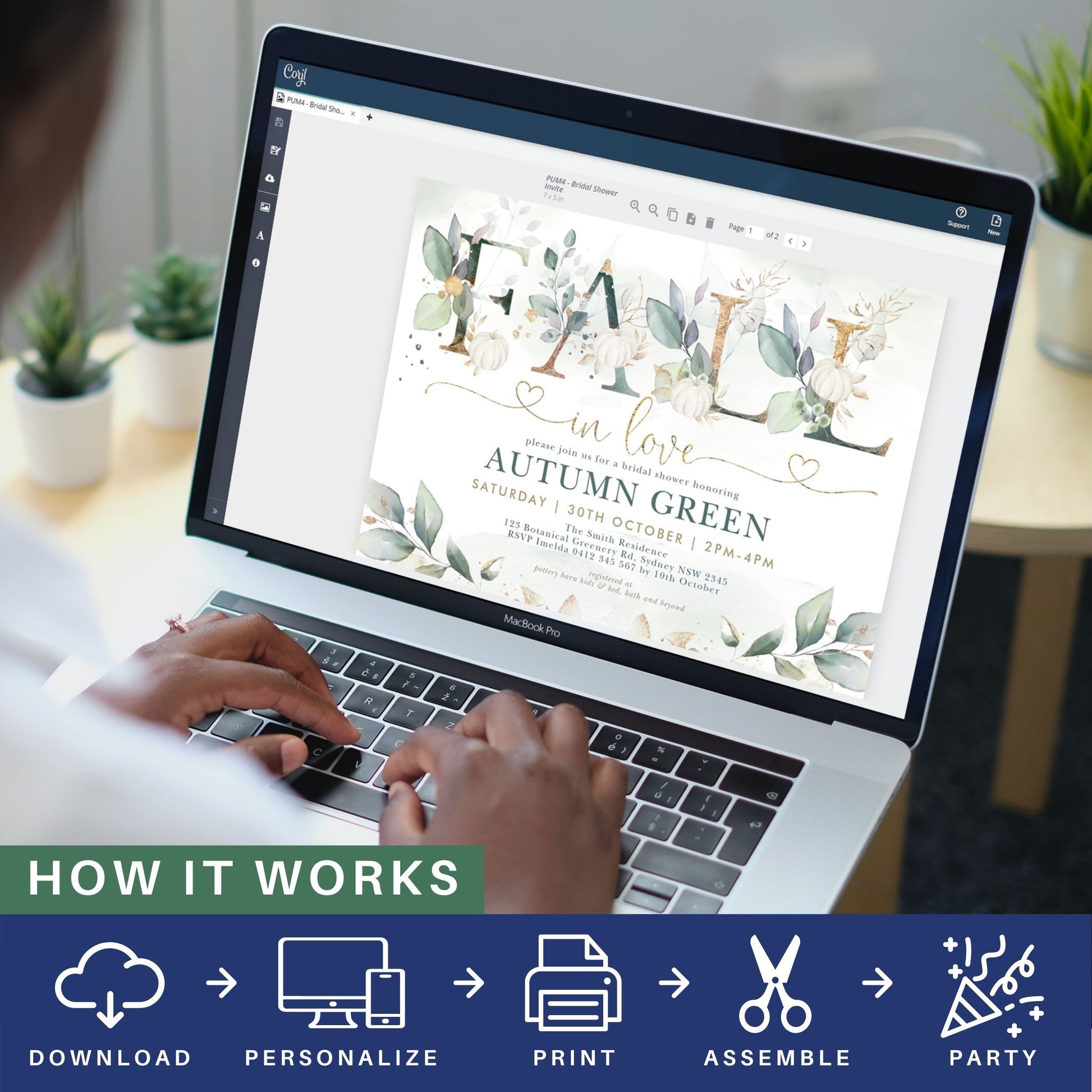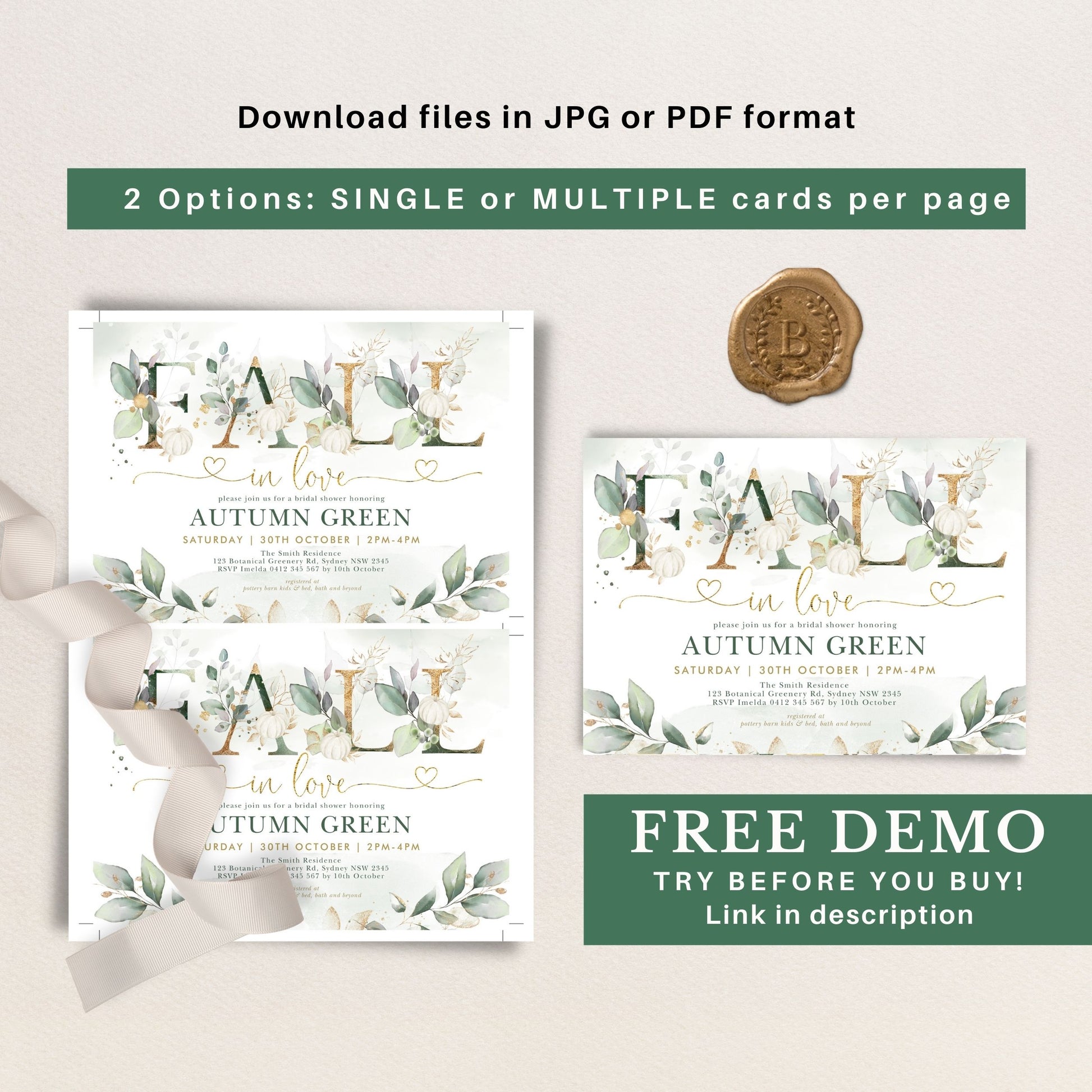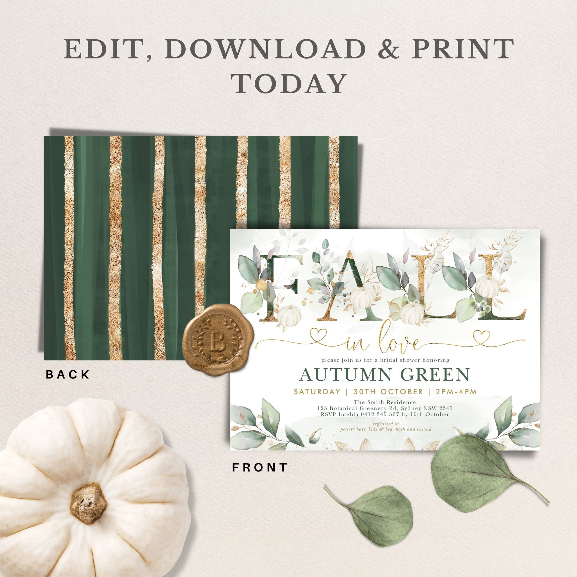 This elegant autumn bridal shower invitation features beautiful alabaster white pumpkins, gorgeous leafy greenery foliage and gold accents.