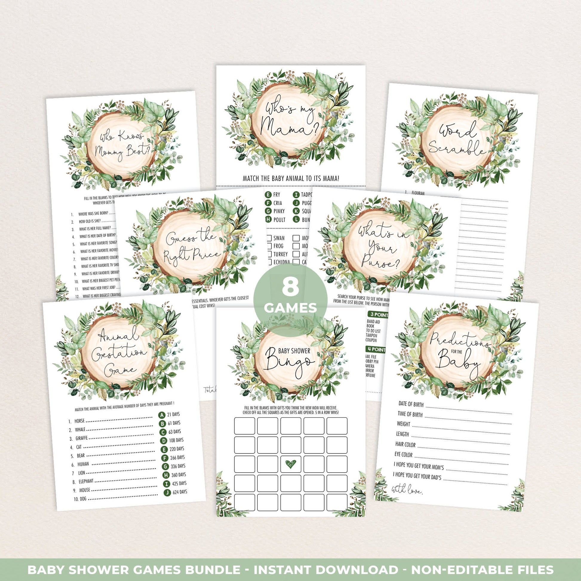 - 8 Different Baby Shower Games in PDF format (2 cards per 8.5"x11" page)