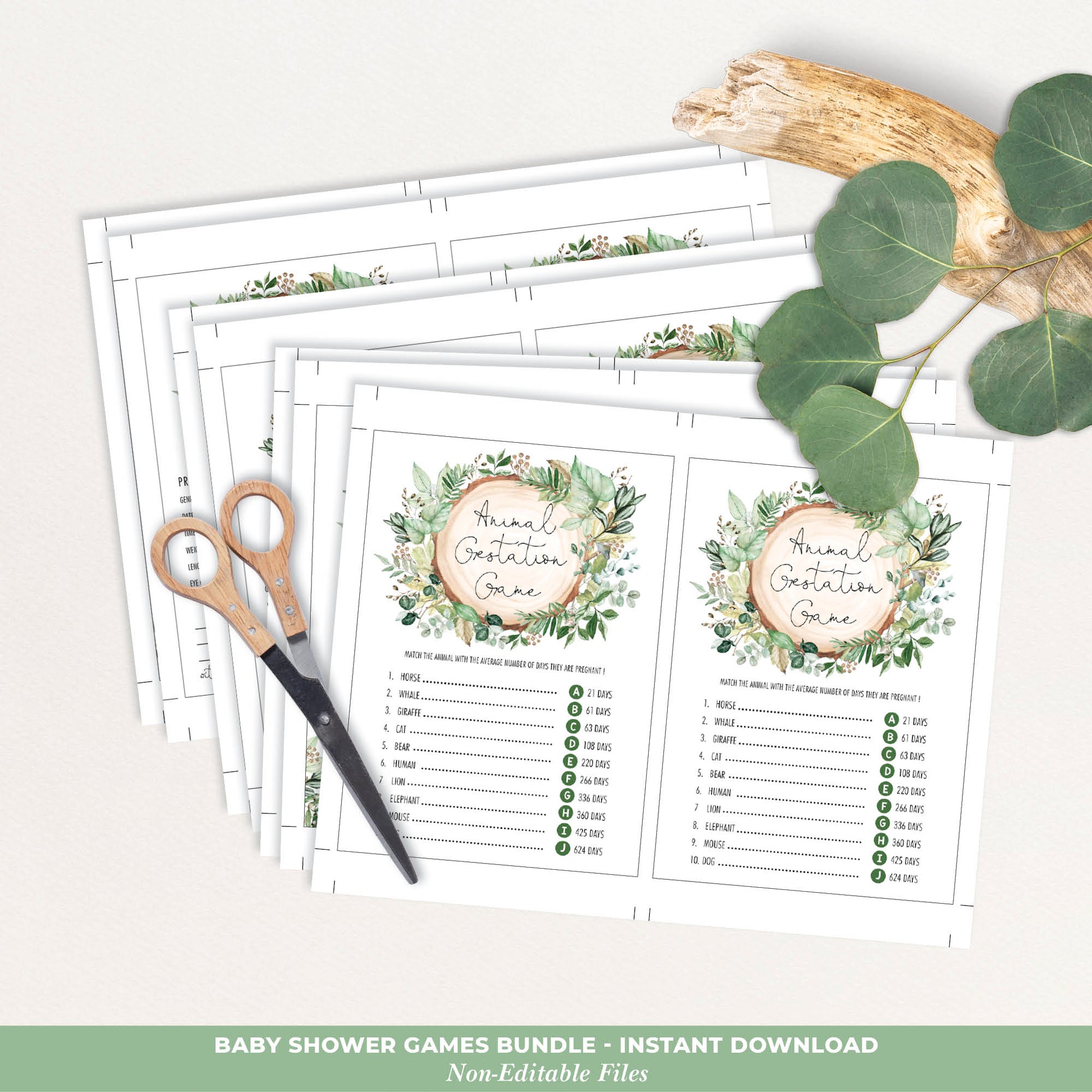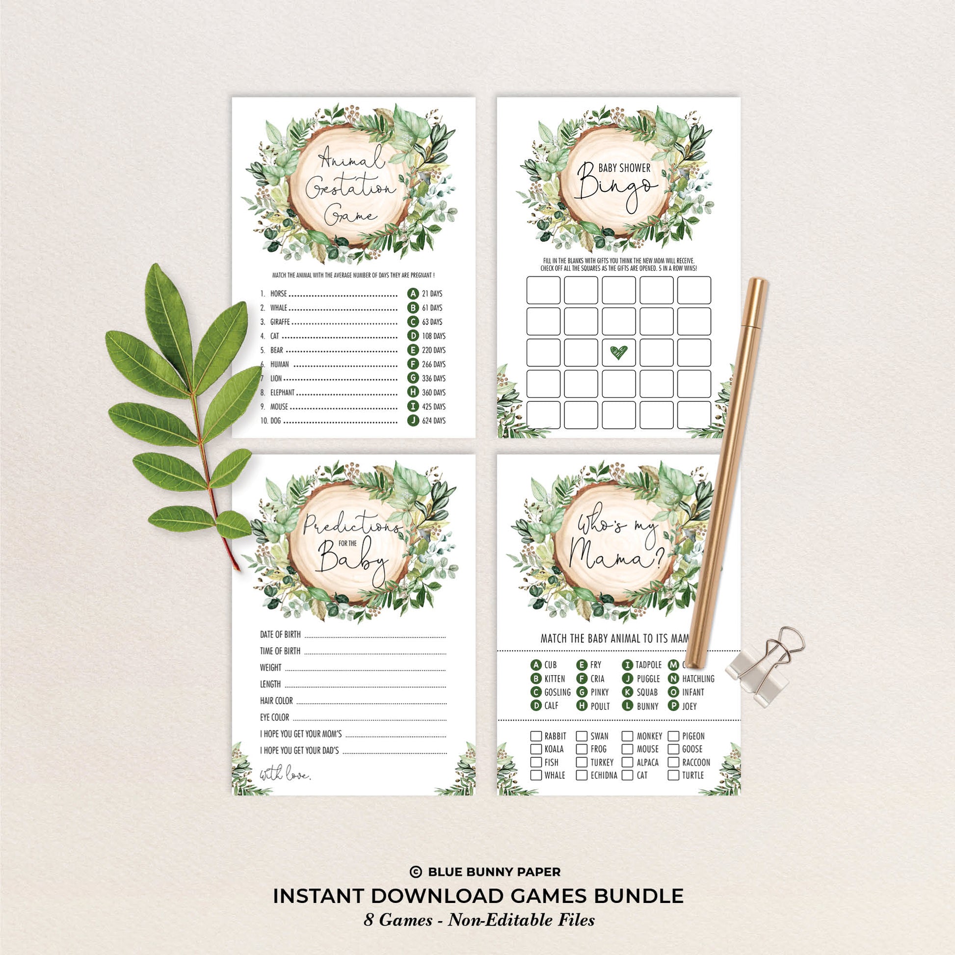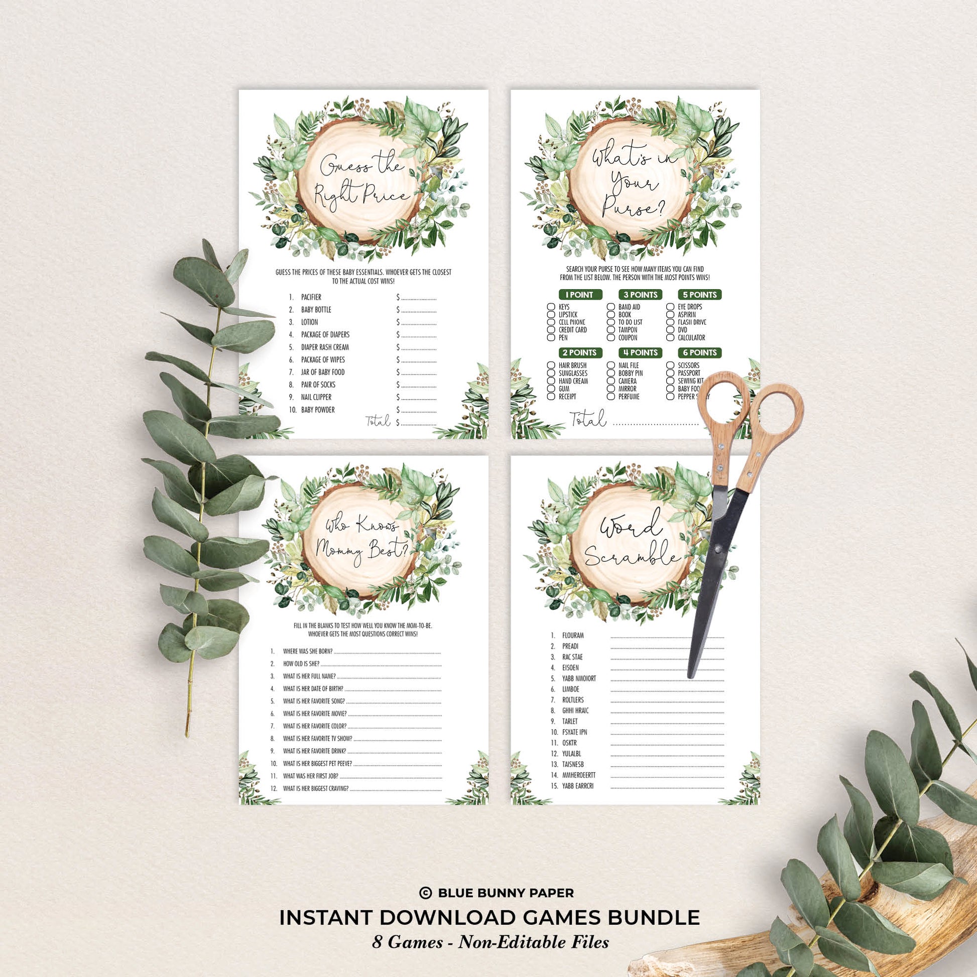 Keep your guests entertained at your baby shower with fun and interactive baby shower games. The elegant design features a great combo of rustic watercolor greenery and modern typography. Download the printables immediately after purchase.