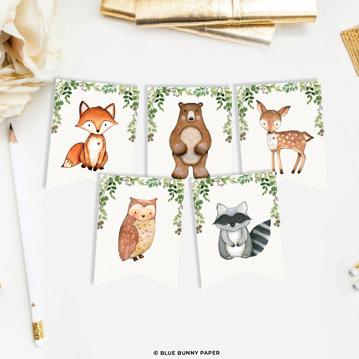 Instant download printable party banner featuring elegant greenery and cute forest animals (fox, bear, deer, raccoon & owl). This banner is the perfect finishing touch to any woodland themed party!