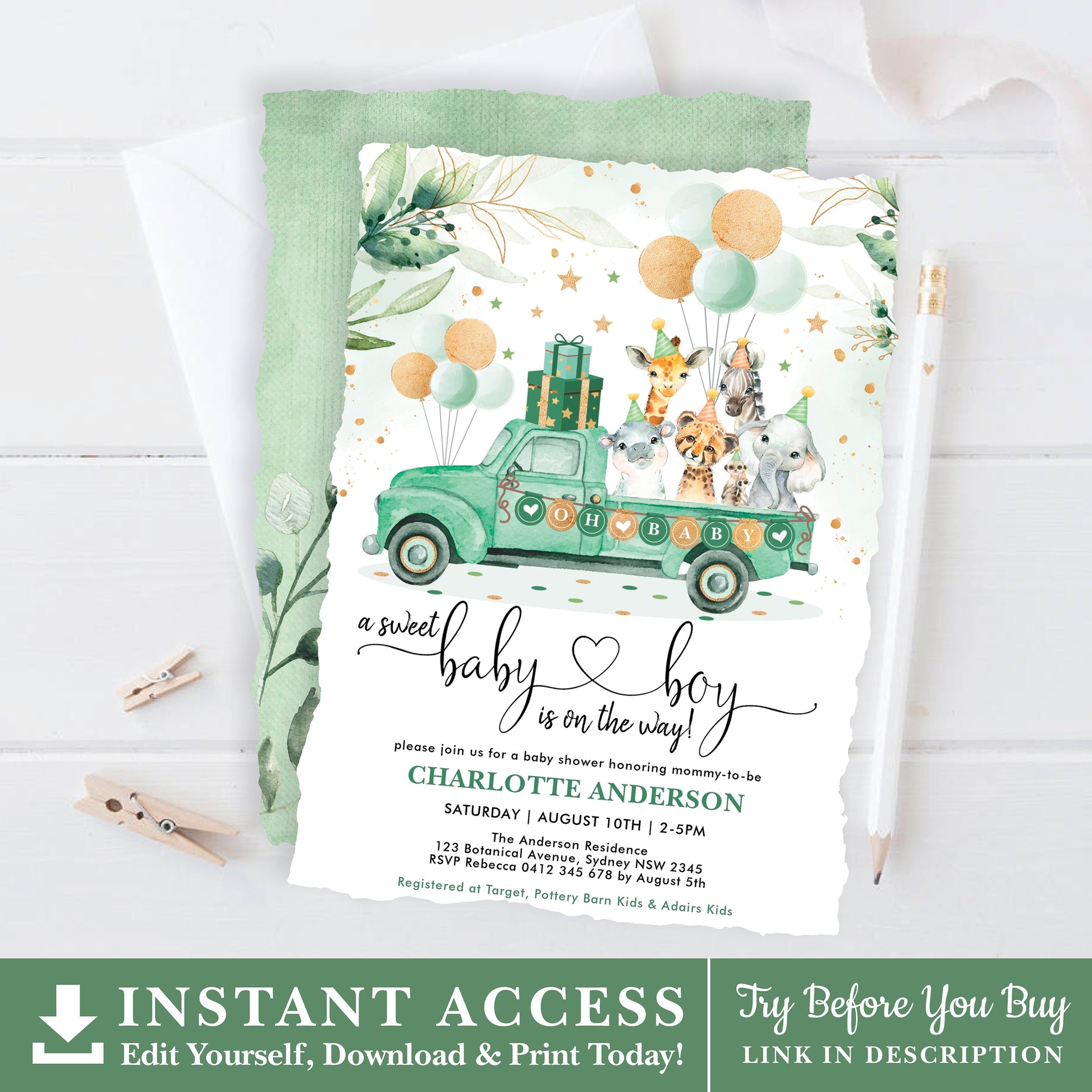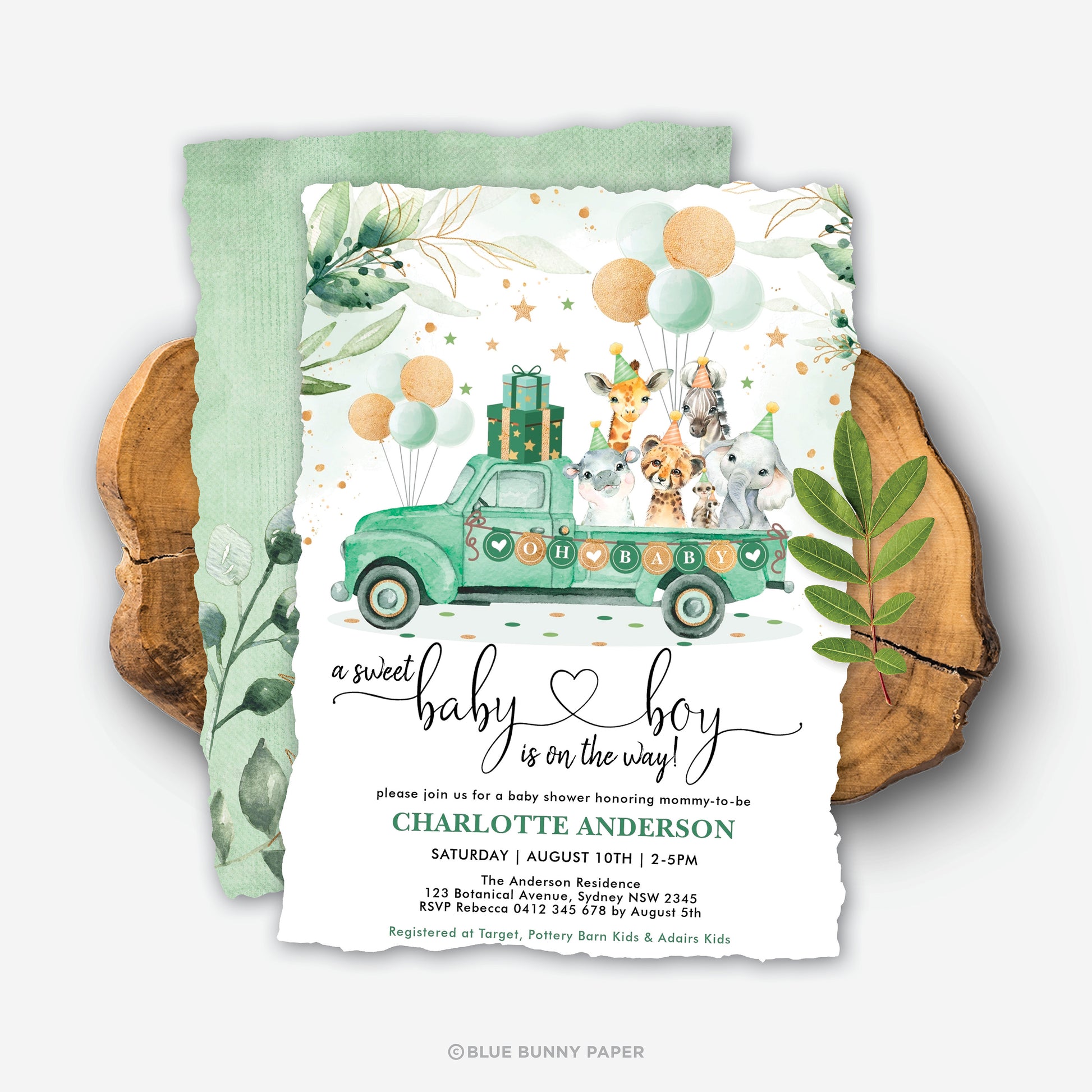Celebrate the upcoming arrival of your little bundle of joy with this whimsical baby shower invitation featuring adorable safari animals, elegant watercolor greenery and festive green and gold balloons.