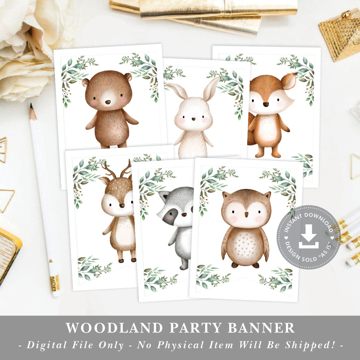 Instant download printable party banner featuring elegant greenery and cute forest animals (fox, bear, deer, raccoon, bunny & owl). This banner is the perfect finishing touch to any woodland themed party!