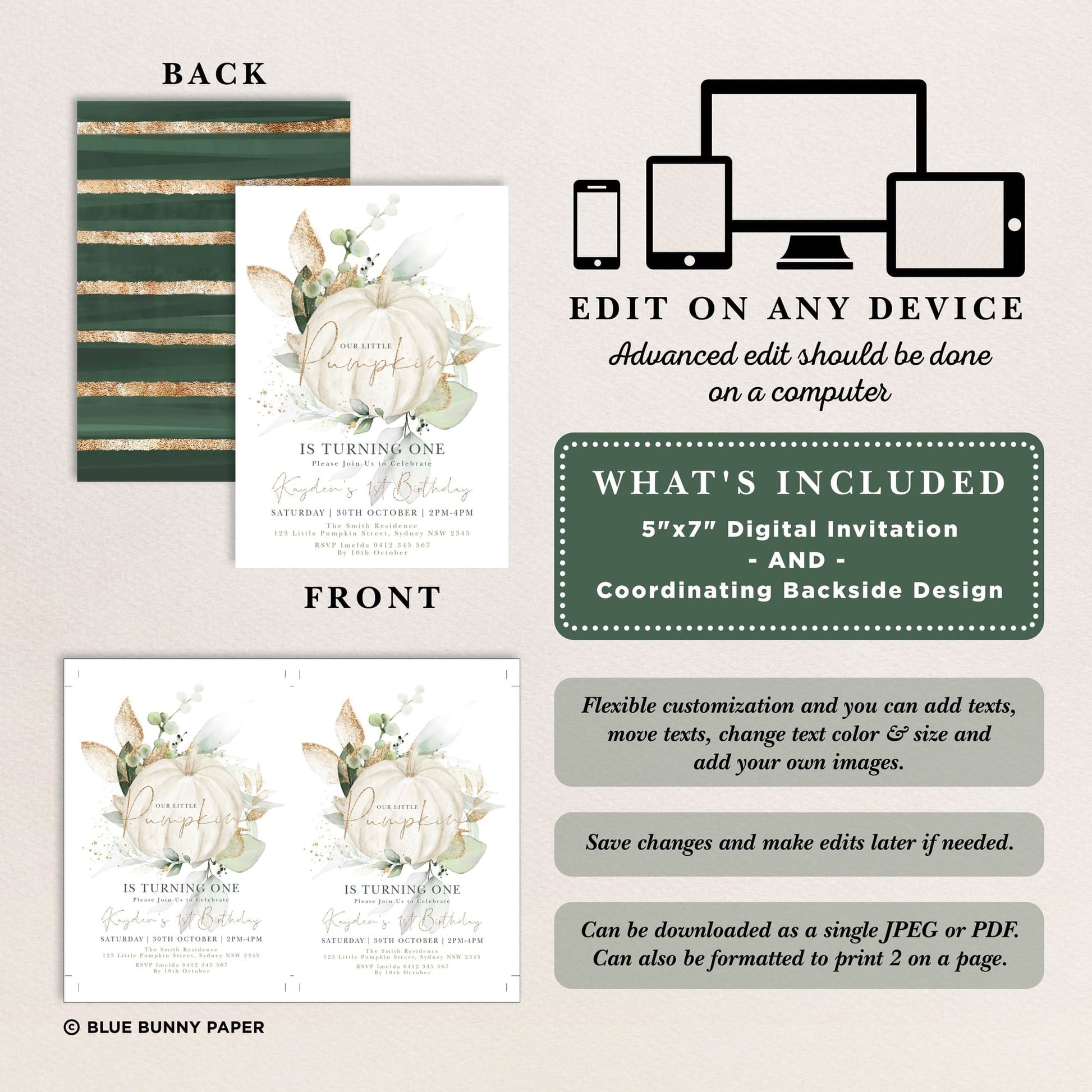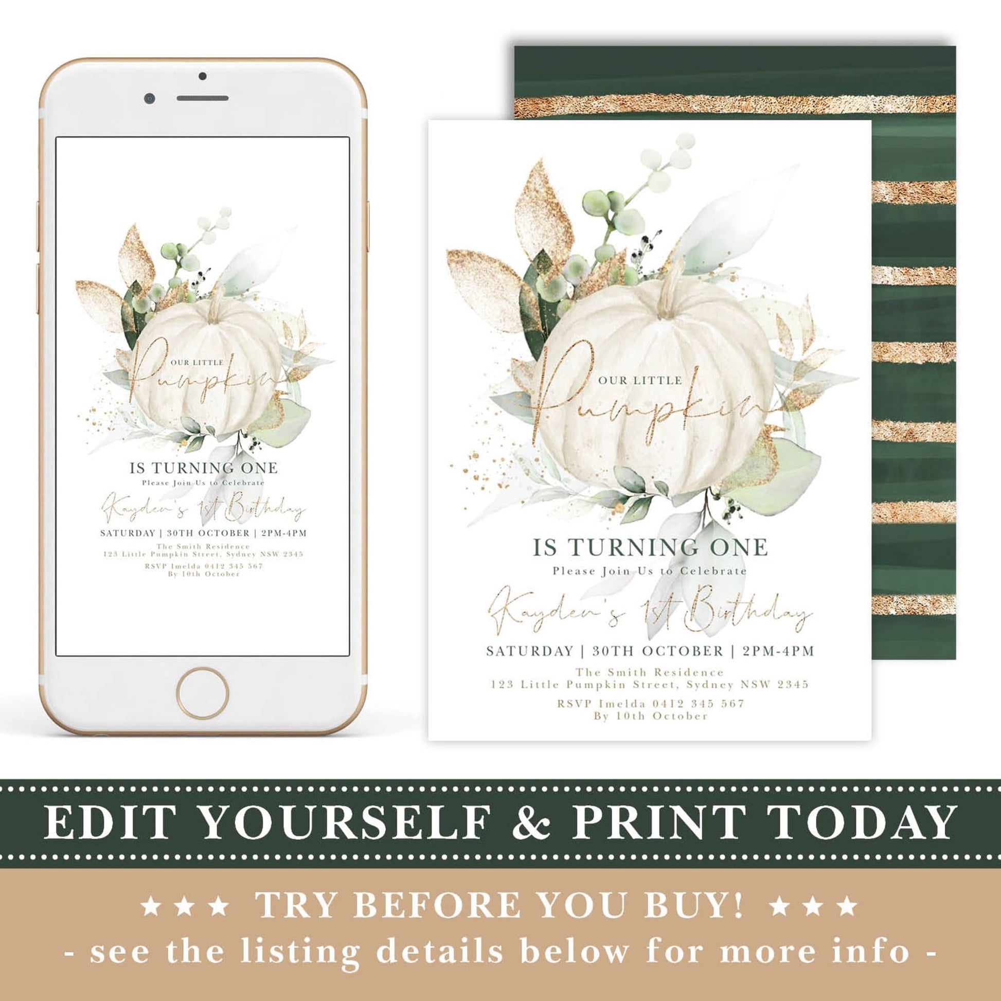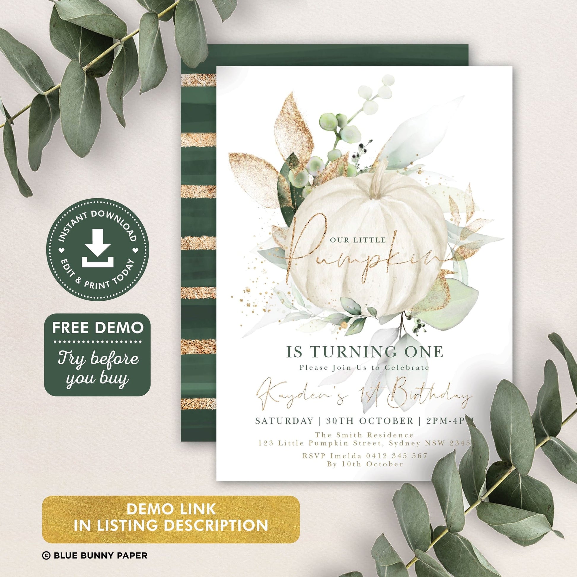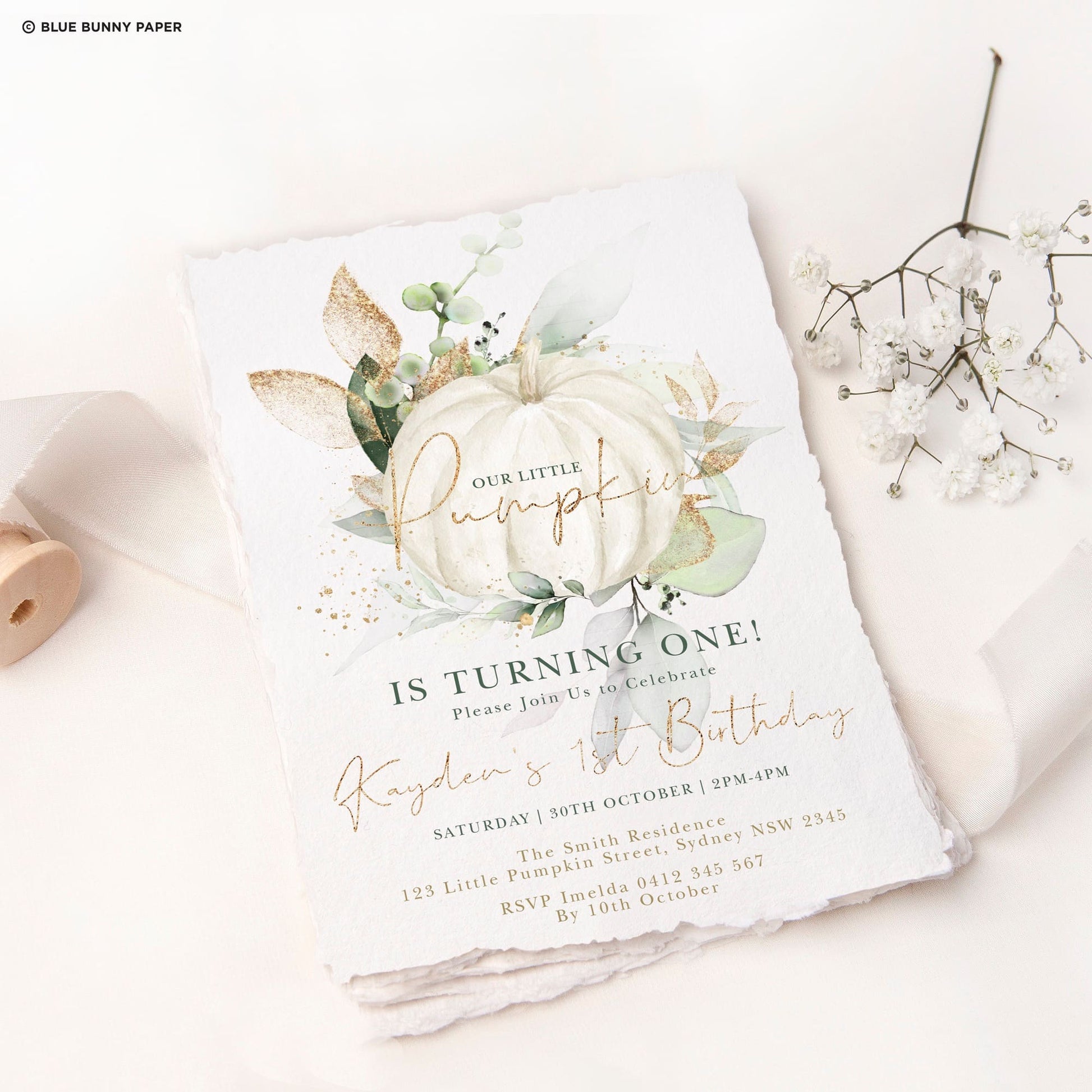 Your little pumpkin is turning ONE! Celebrate your baby's special milestone with this elegant first birthday invitation featuring cute alabaster white pumpkins and gorgeous leafy greenery foliage in green and gold.