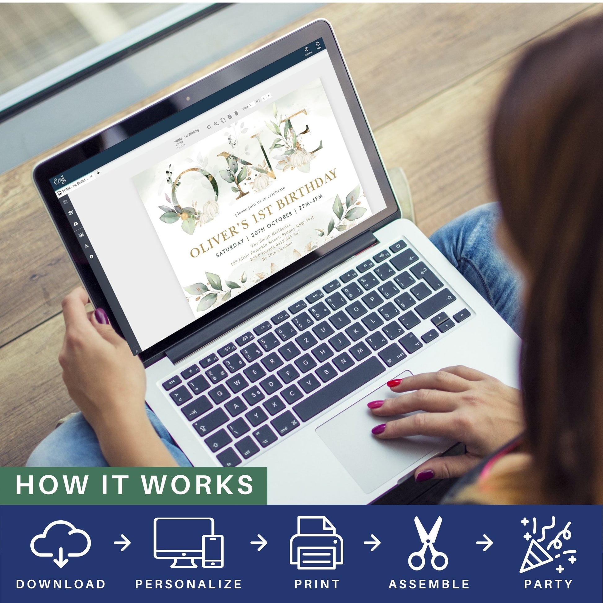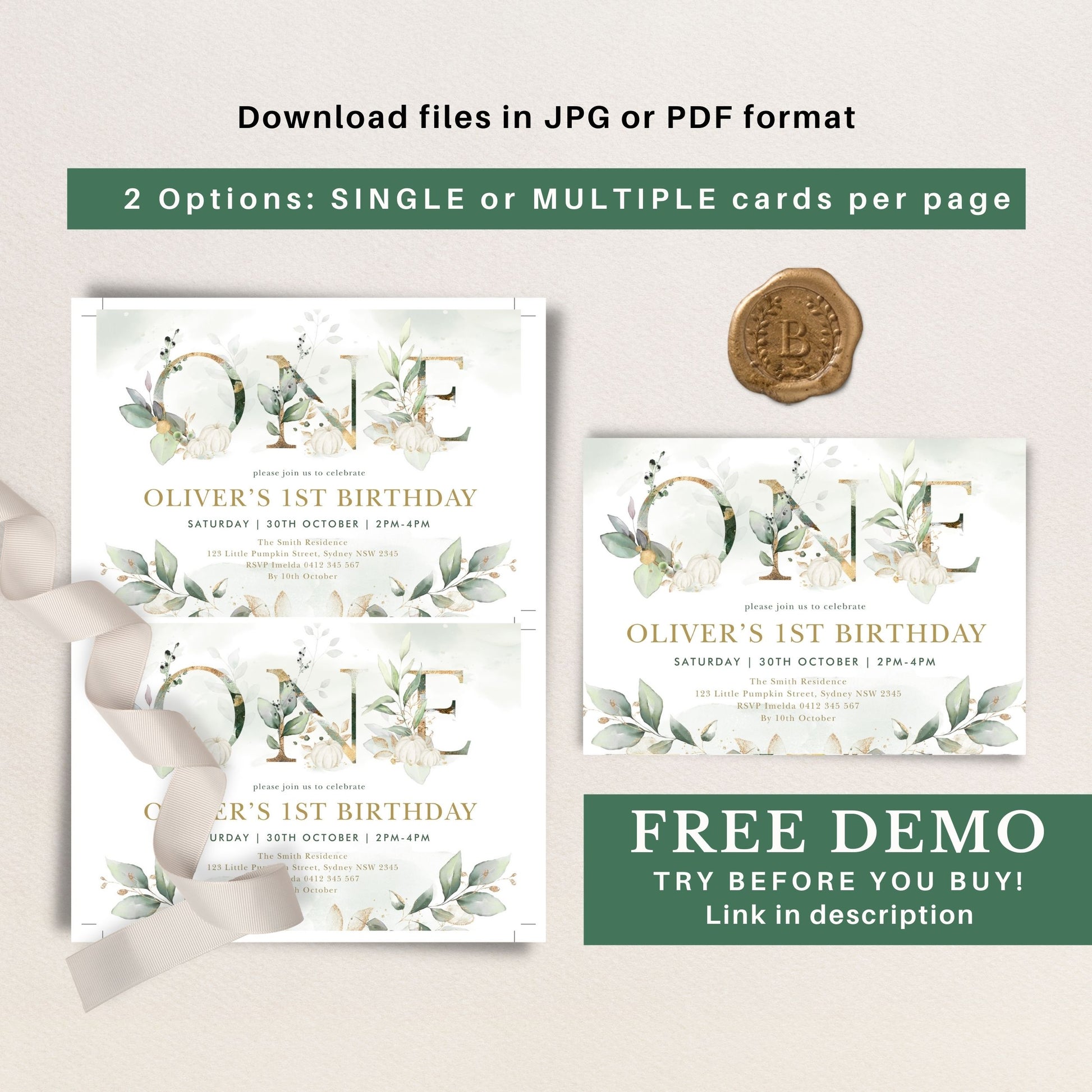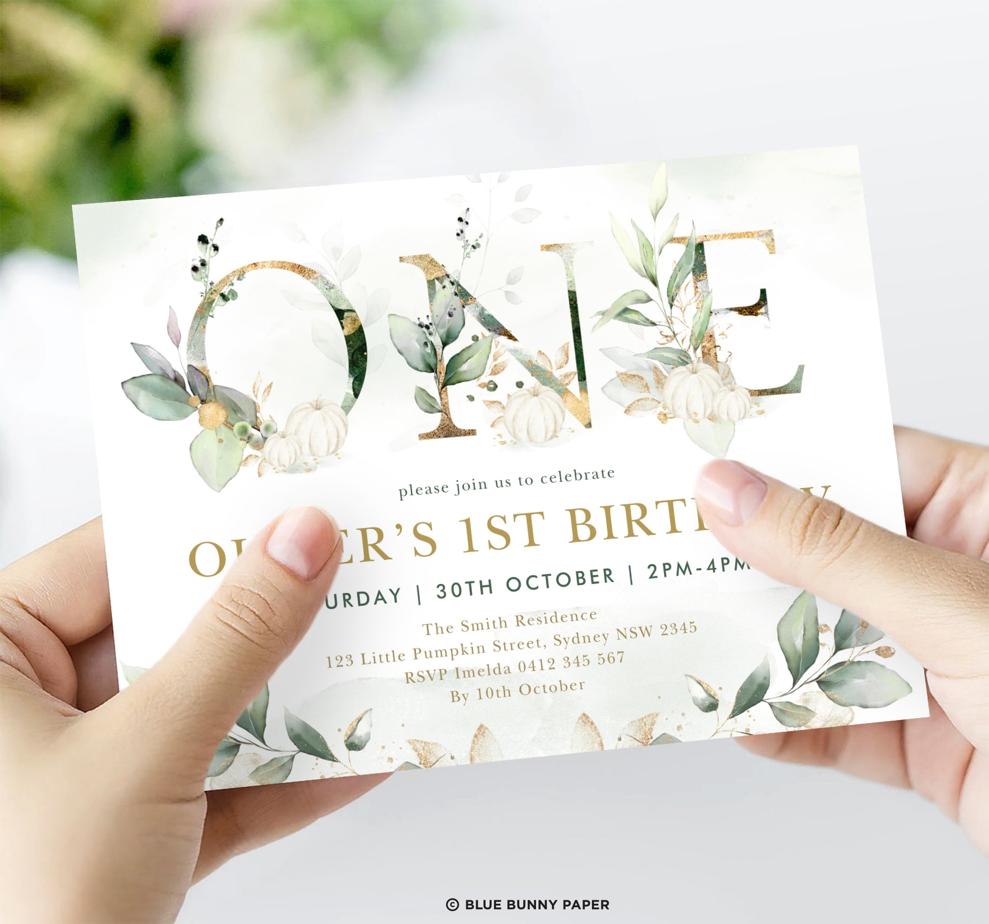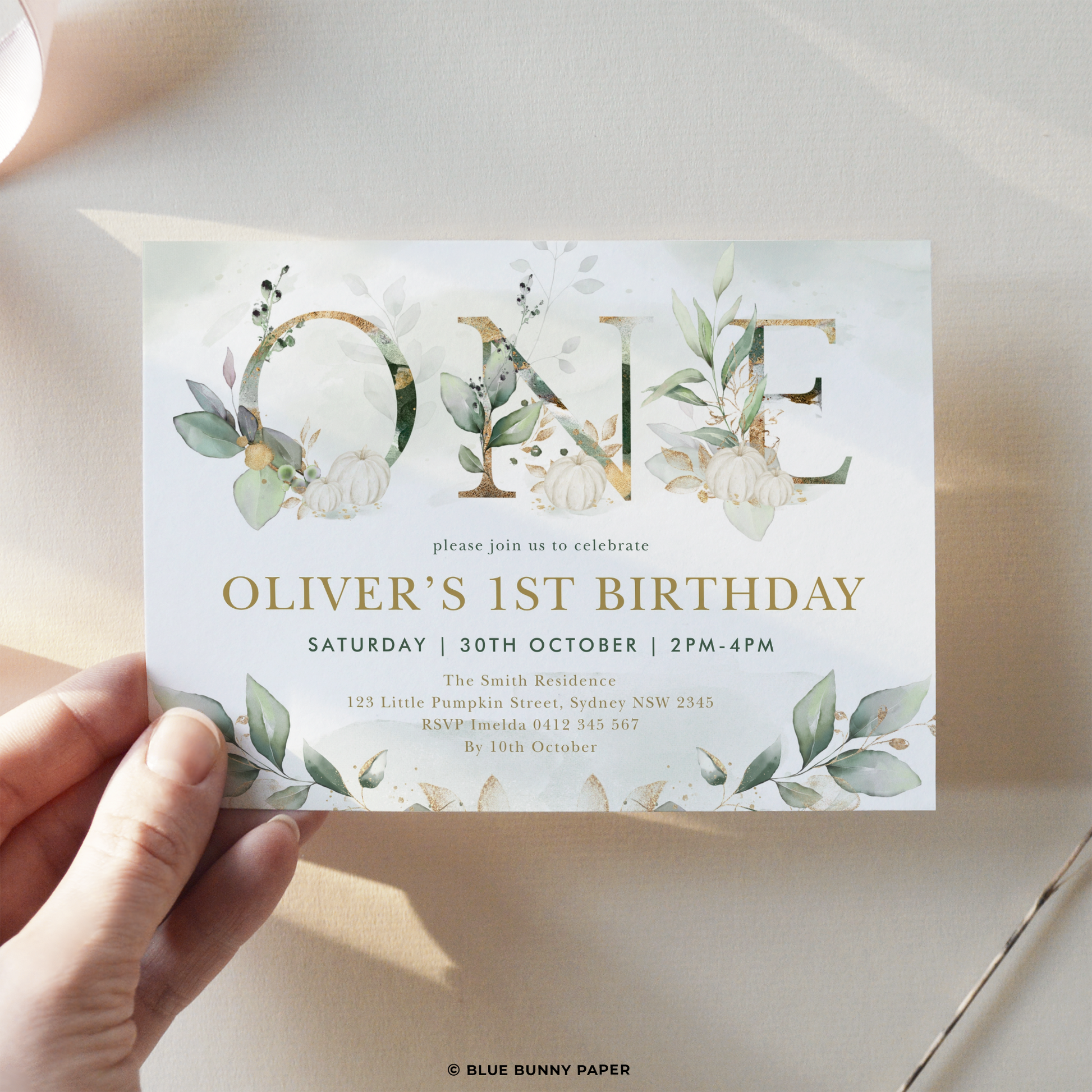 Your little pumpkin is turning ONE! Celebrate your baby's special milestone with this elegant first birthday invitation featuring cute alabaster white pumpkins and gorgeous leafy greenery foliage in green and gold.