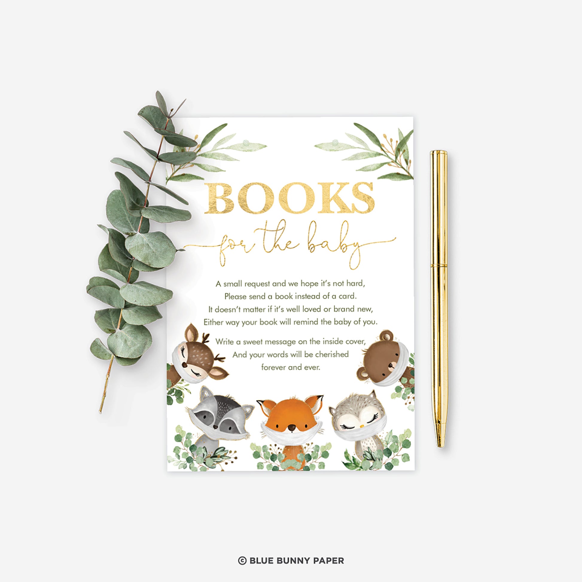 Send out this "books for baby" insert card together with your baby shower invitation to encourage your guests to bring a book instead of a greeting card. Featuring cute woodland animals wearing masks and modern watercolor greenery, this adorable design is sure put a smile on your guests' faces.