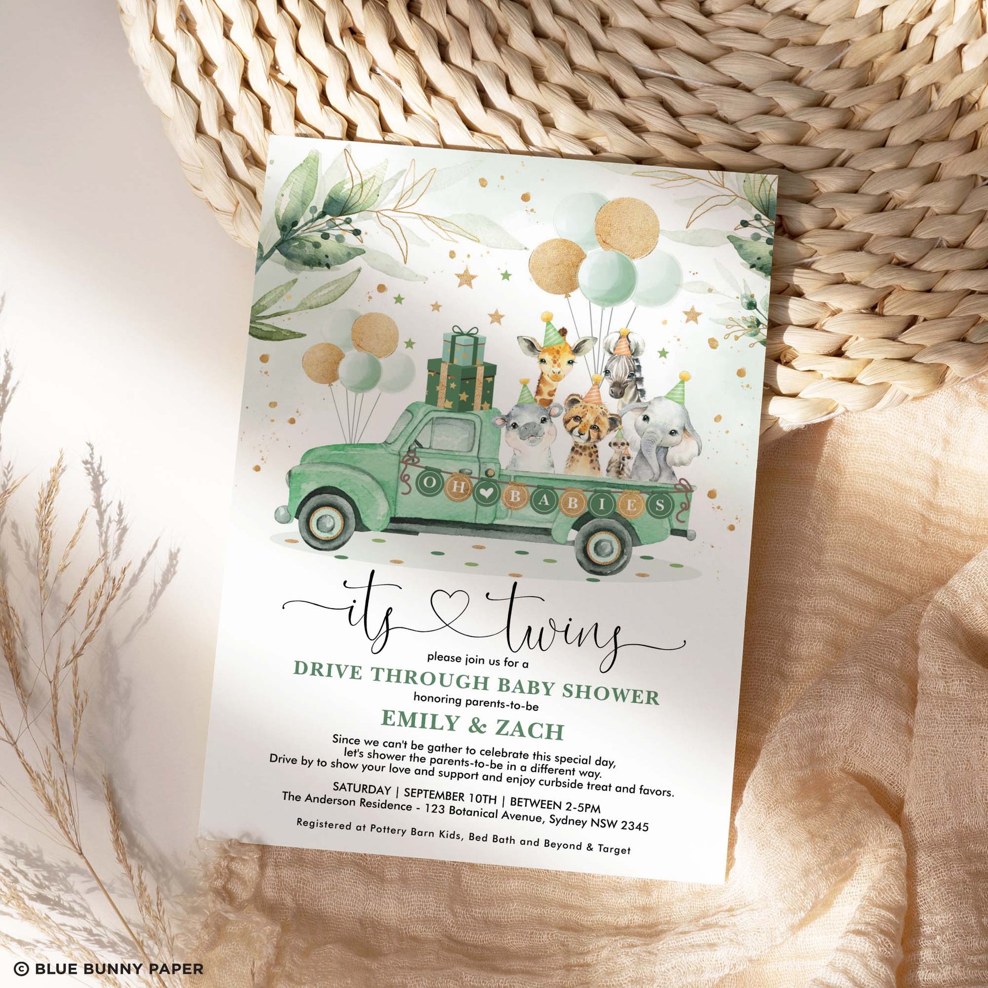 Twice the laughs, double the grins! Celebrate the upcoming arrival of your two bundles of joy with this whimsical baby shower invitation featuring adorable safari animals, elegant watercolor greenery and festive green and gold balloons.