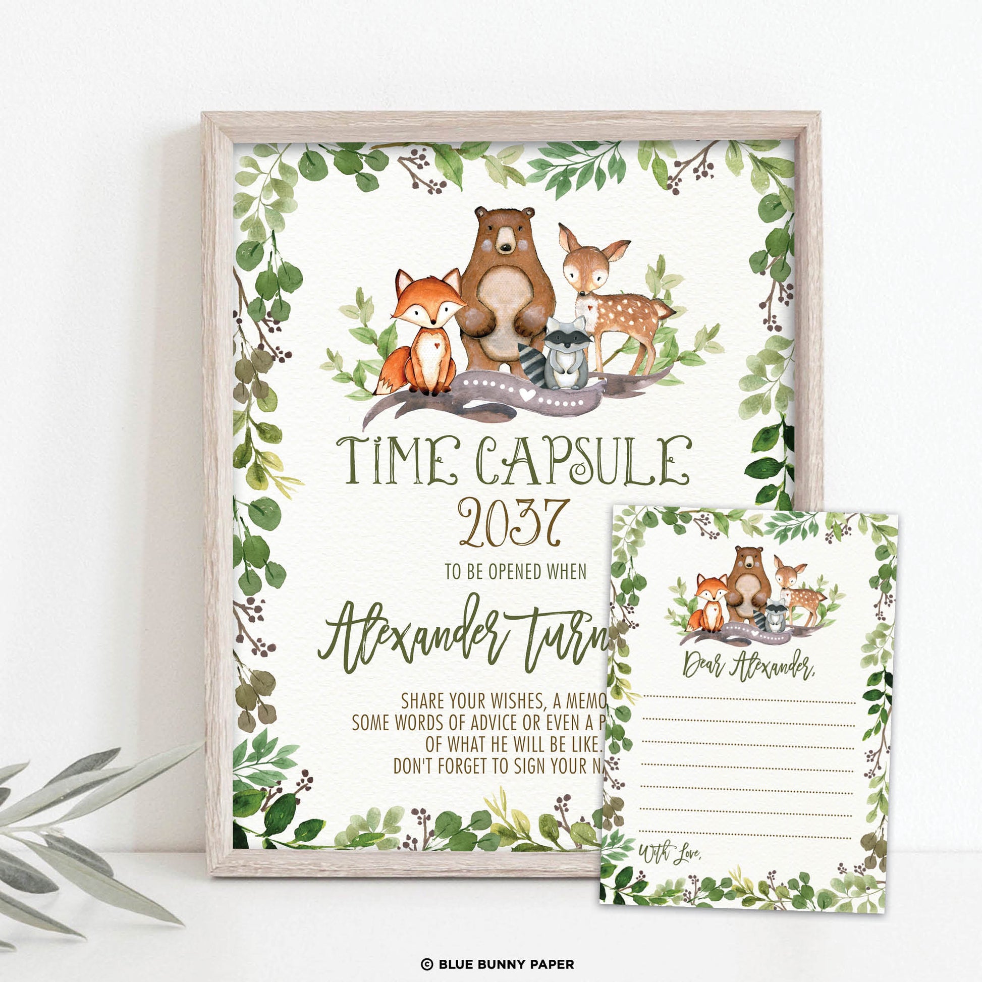 A time capsule is a wonderful activity for a first birthday or baby shower. Let your guests write a message for your baby boy to be opened when he turns 18, and store the message cards in a capsule or a box. The design is matching our "Greenery Woodland Animals" collection featuring rustic watercolor greenery and adorable forest animals.