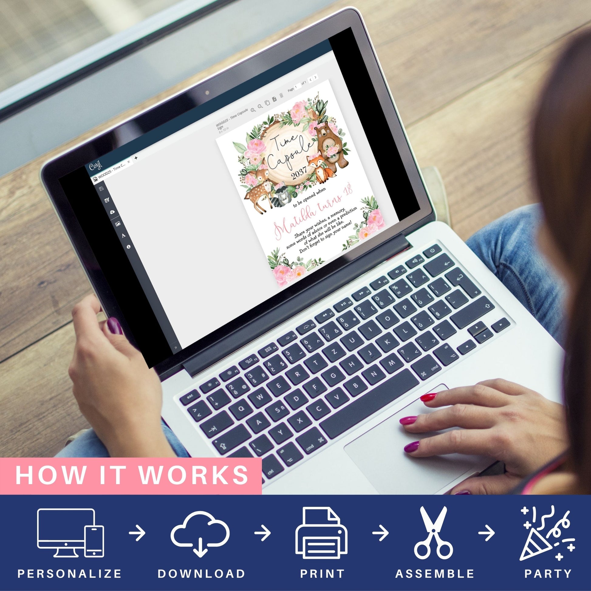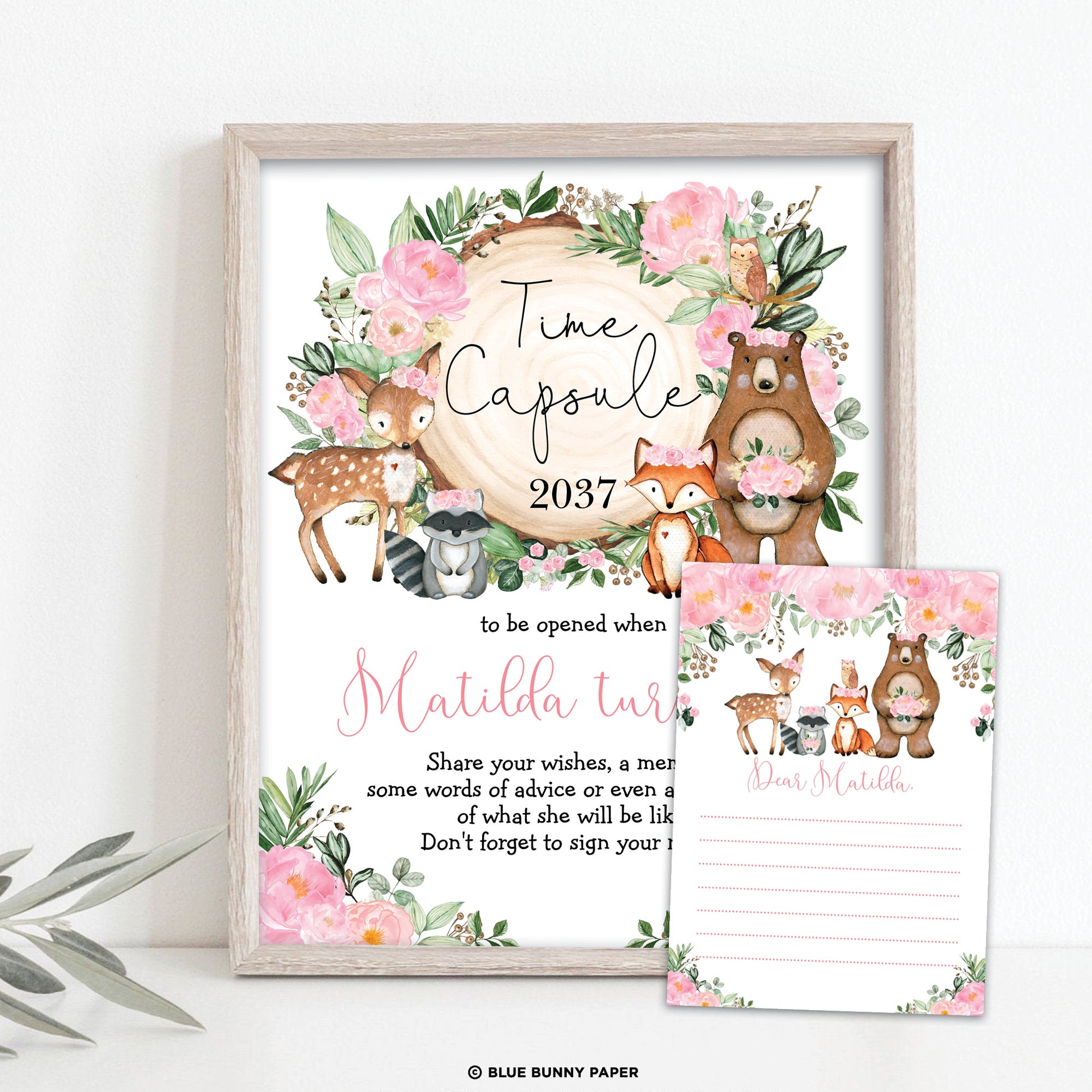 Create a beautiful time capsule on your baby's 1st birthday to give them on their 18th birthday. Ask your guests to write their wishes, predictions and some words of advice for the birthday girl and store the message cards in a capsule or a box. This timeless gift can spark some of the best conversations with your kids. It's a great way to show them just how loved they are. The design is matching our "Spring Forest" collection featuring adorable woodland animals, pretty pink flowers and rustic greenery.