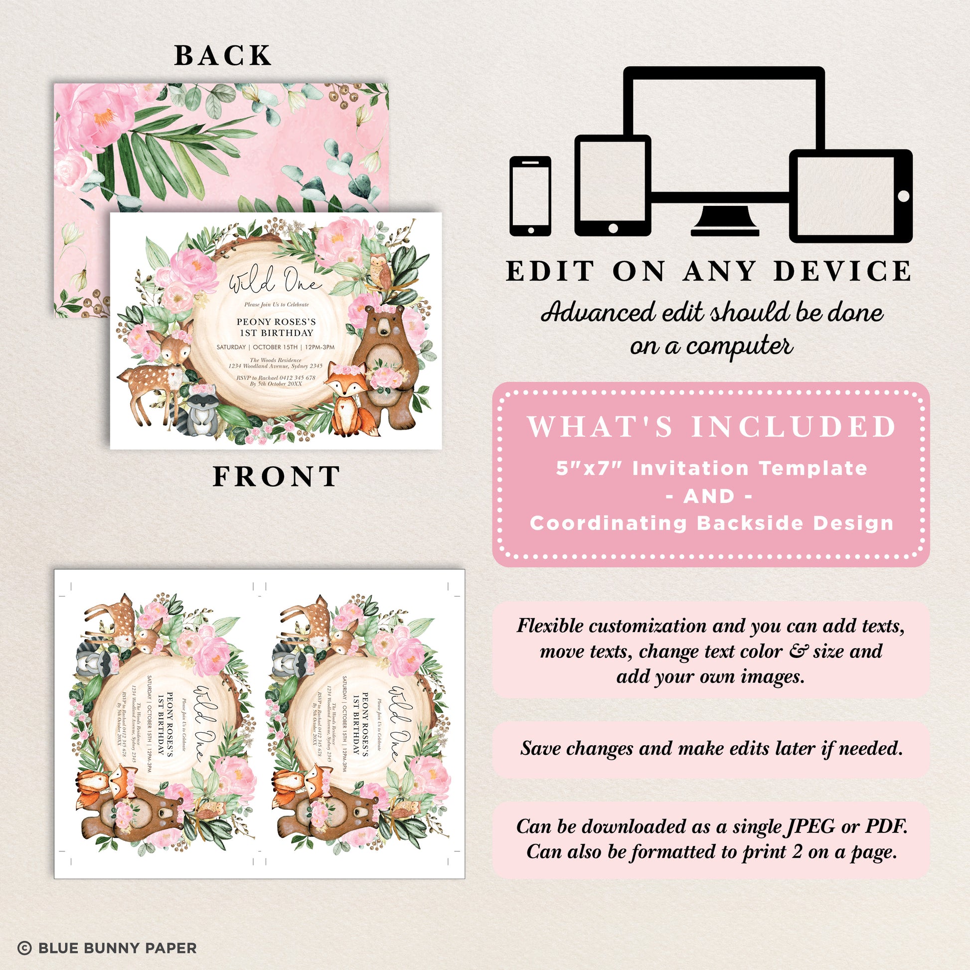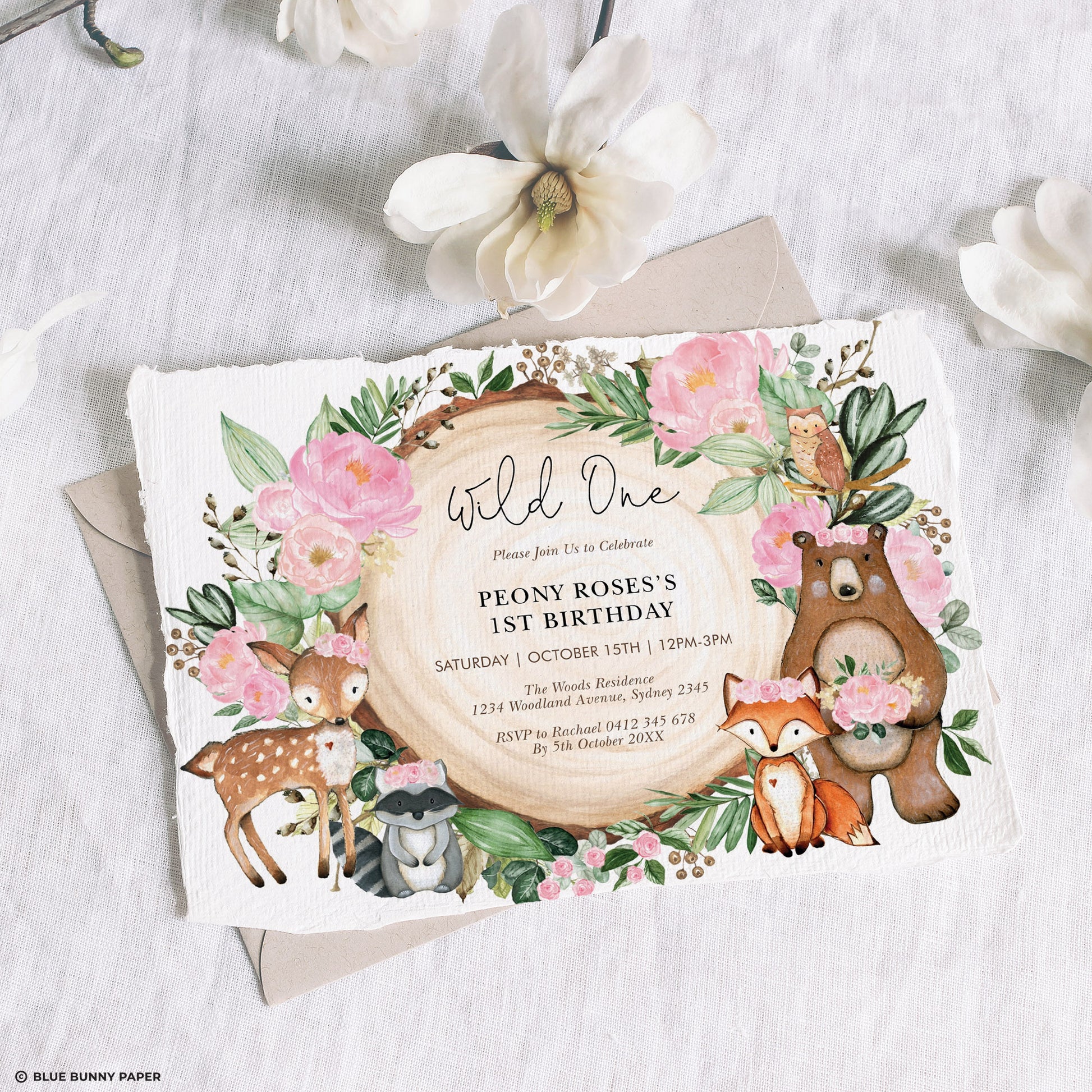 She's turning a WILD ONE! Celebrate your little girl's 1st birthday with this whimsical woodland themed birthday invitation featuring adorably illustrated woodland creatures , blush pink florals and rustic botanical elements.