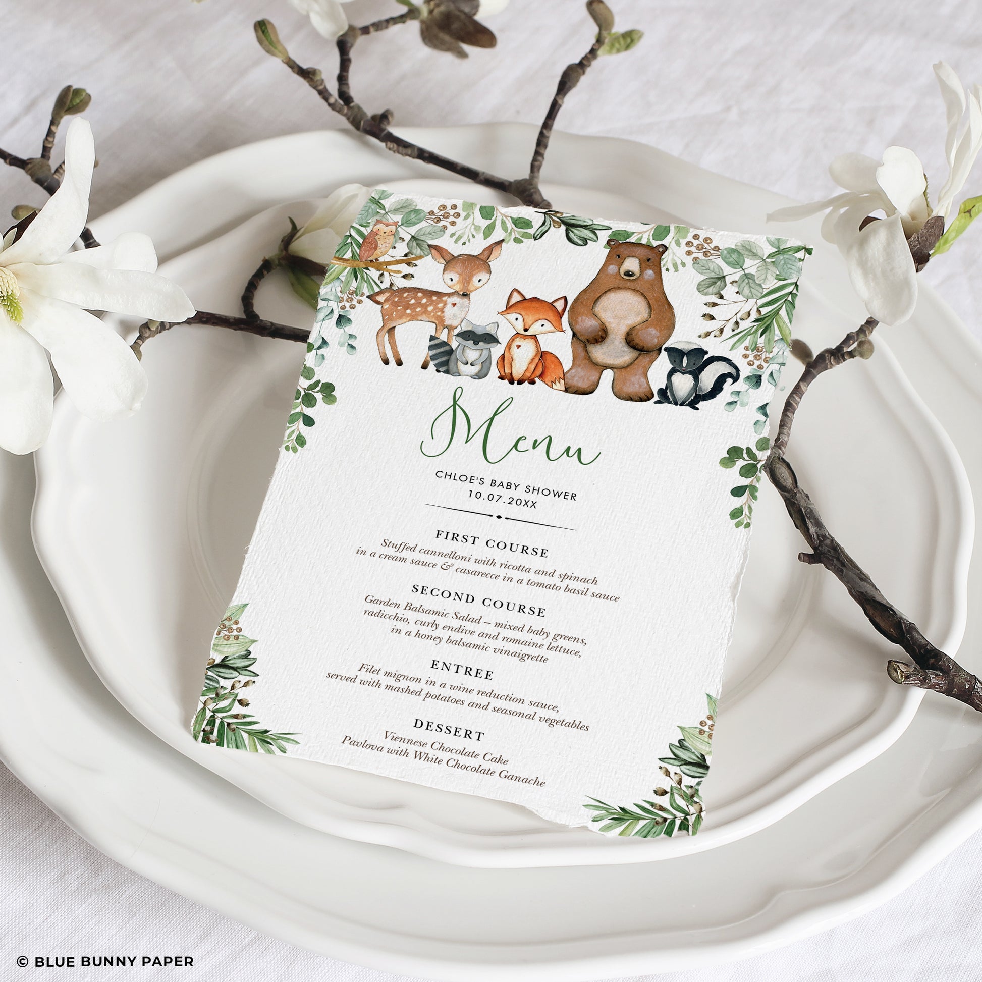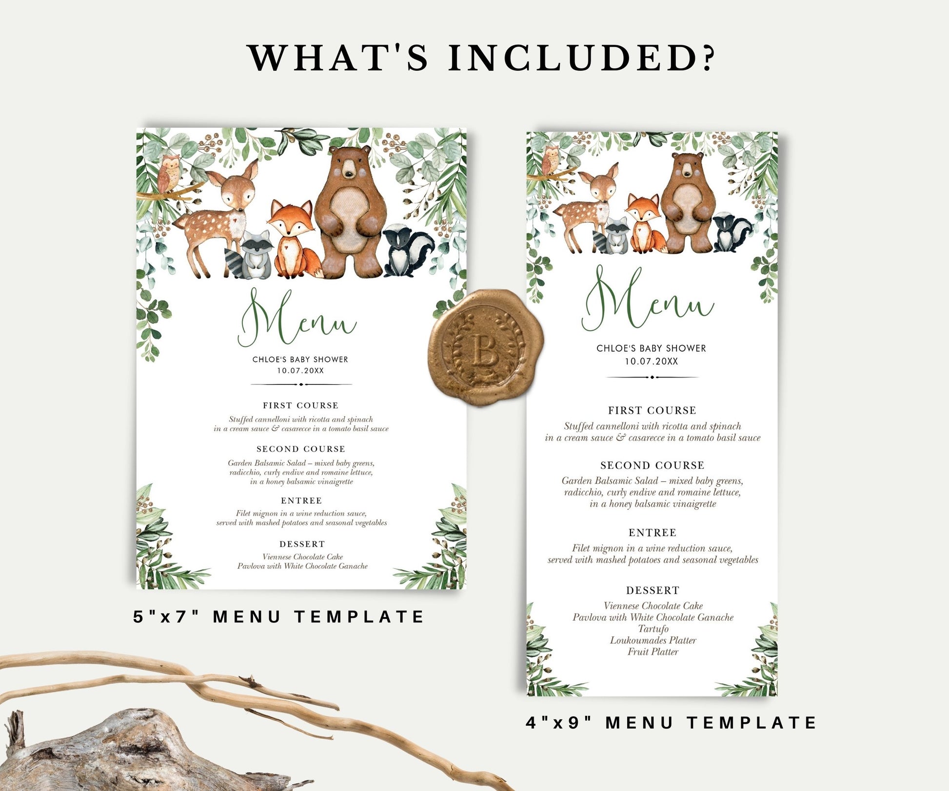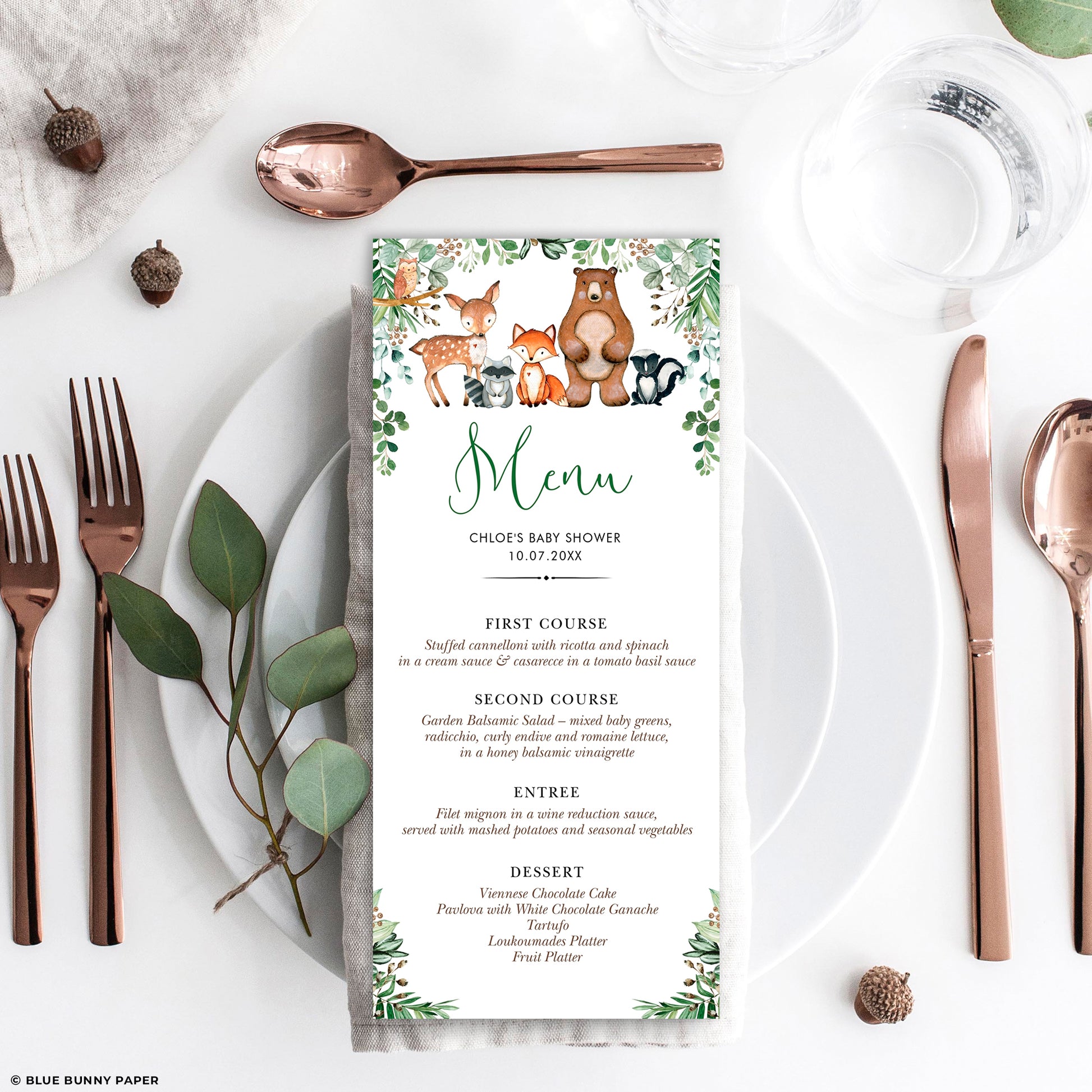 Our editable menu card templates will add a lovely touch to your table setting. Featuring cute forest animals and rustic watercolor greenery, it's the perfect addition to any woodland-themed party or celebration.
