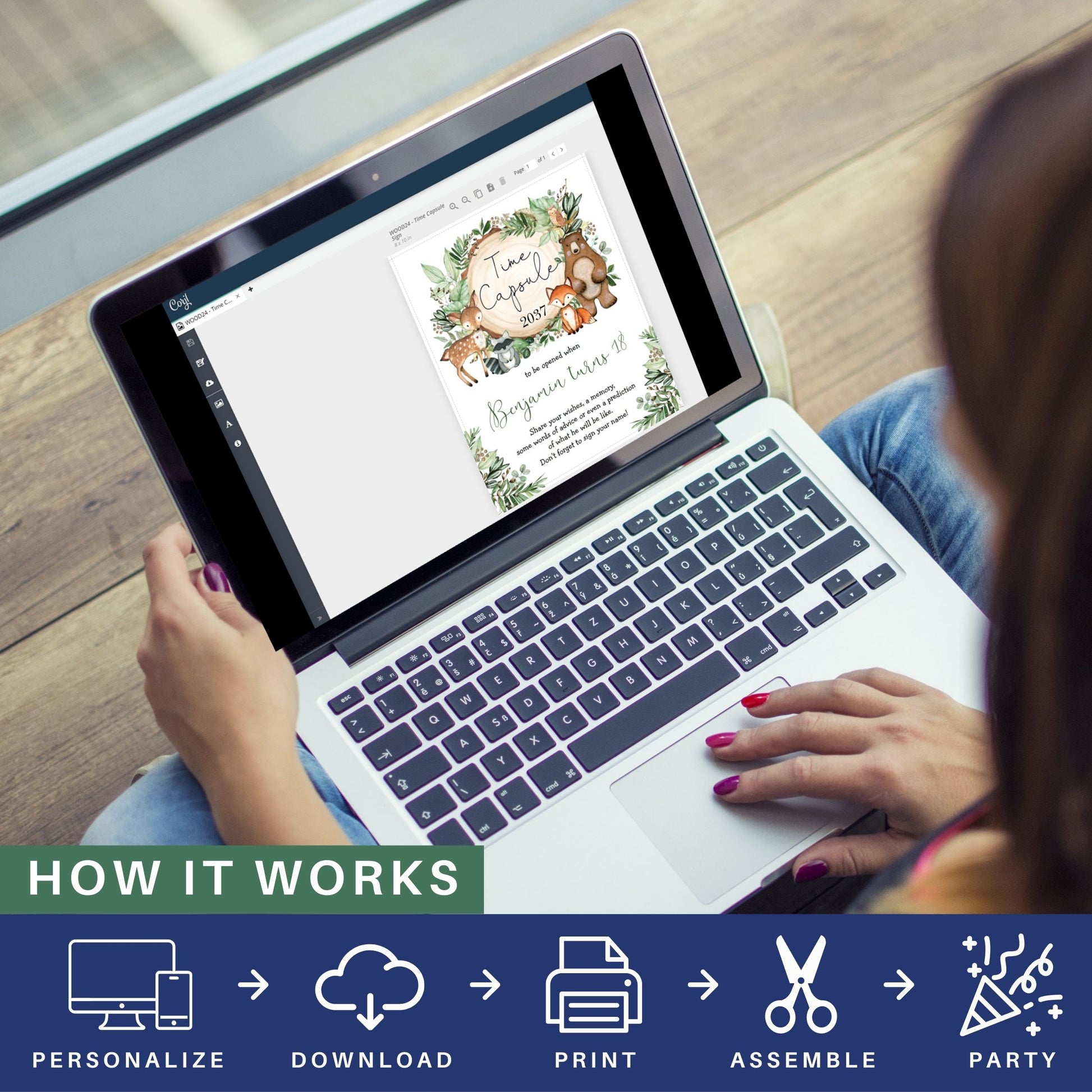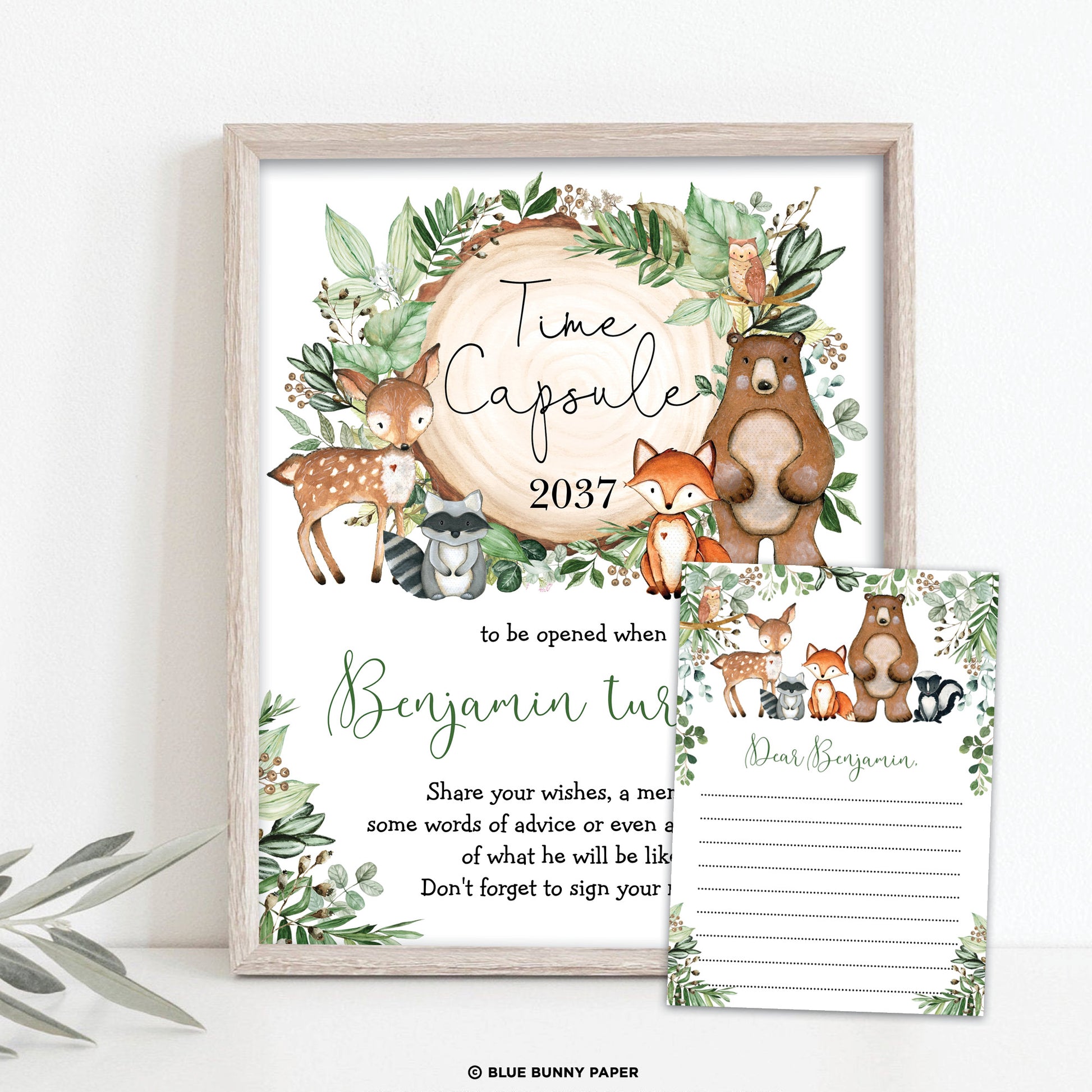 A time capsule is a wonderful activity for a first birthday or baby shower. Let your guests write a message for your baby boy to be opened when he turns 18, and store the message cards in a capsule or a box. It will make for a touching moment on your child's 18th birthday when he gets to open his time capsule and see how loved and cherished he is. The design is matching our "Woodland Wonder" collection featuring rustic watercolor greenery and adorable forest animals.